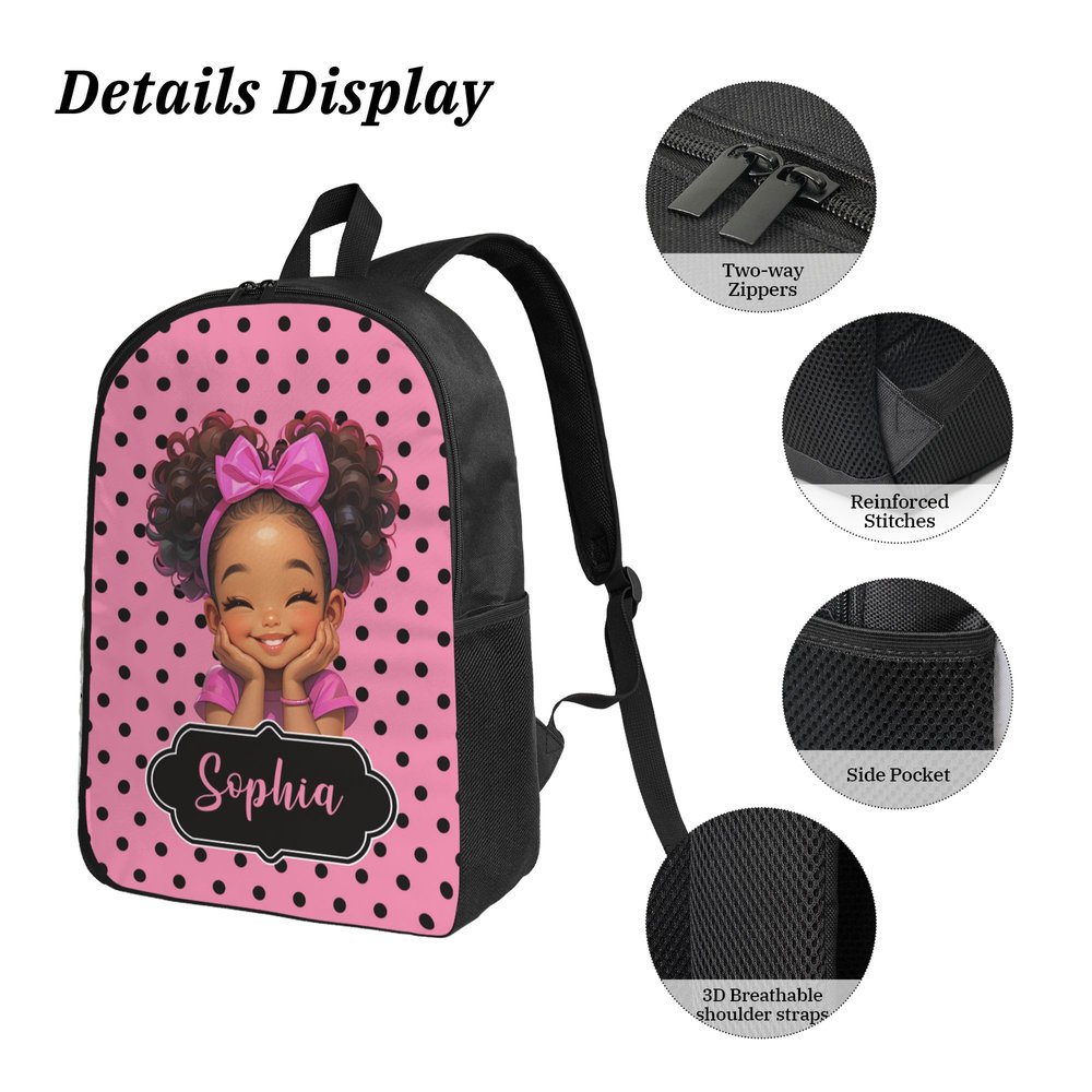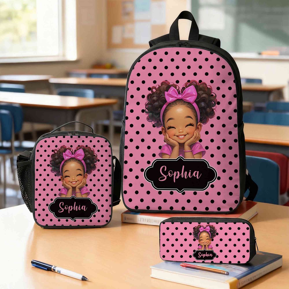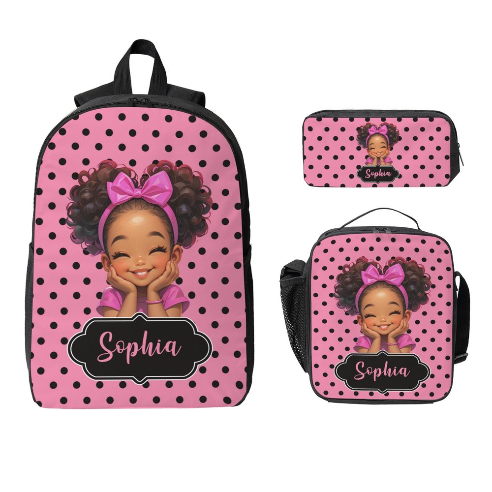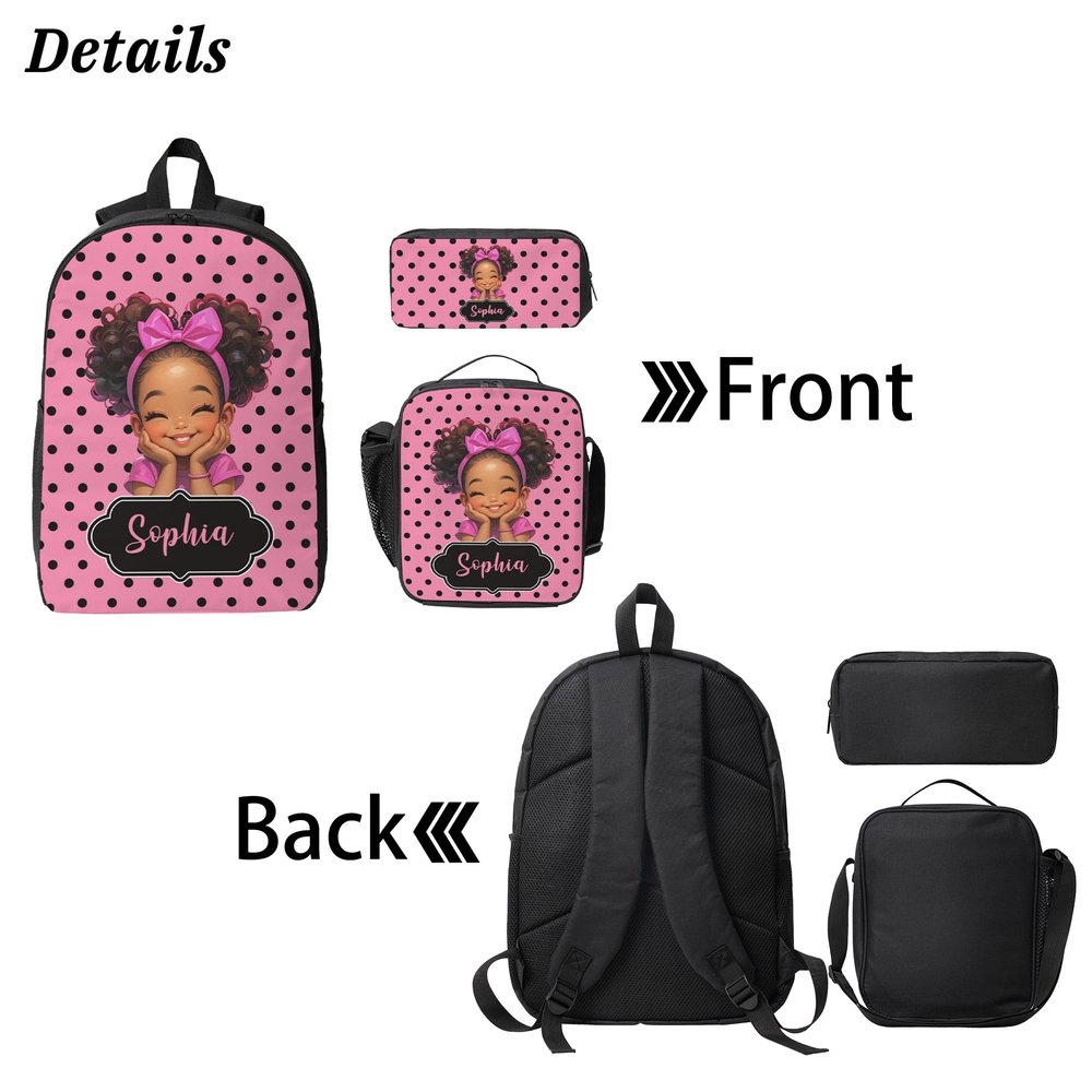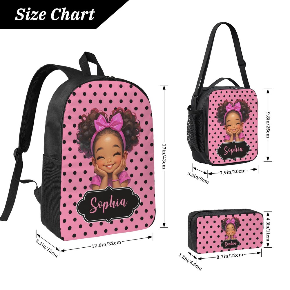 Custom Name Cartoon Afro Black Girl Polka Dots Backpack with Pencil Case & Lunch Bag, Large Capacity Schoolbag, Back to School/Birthday Gift for Girls