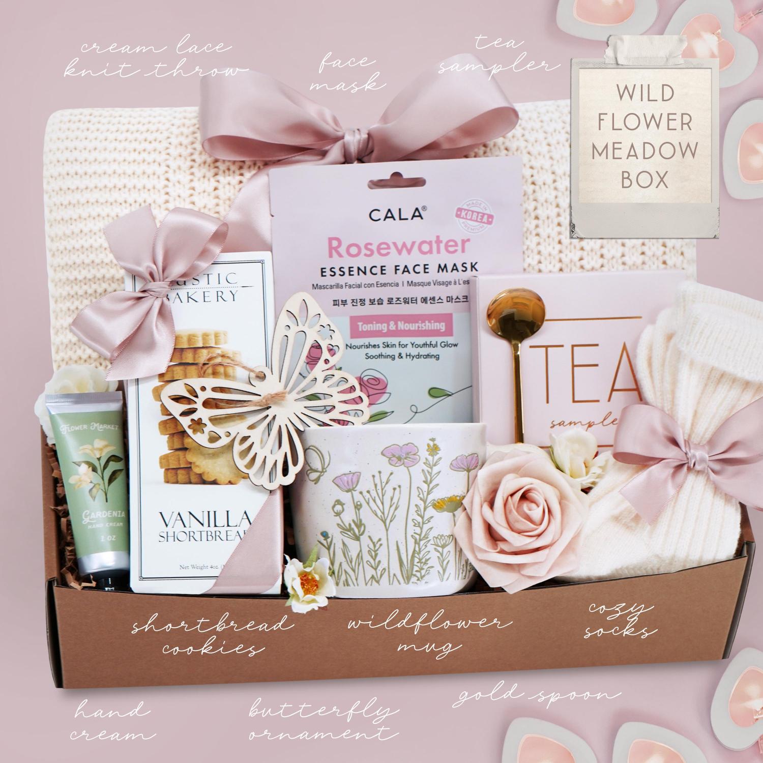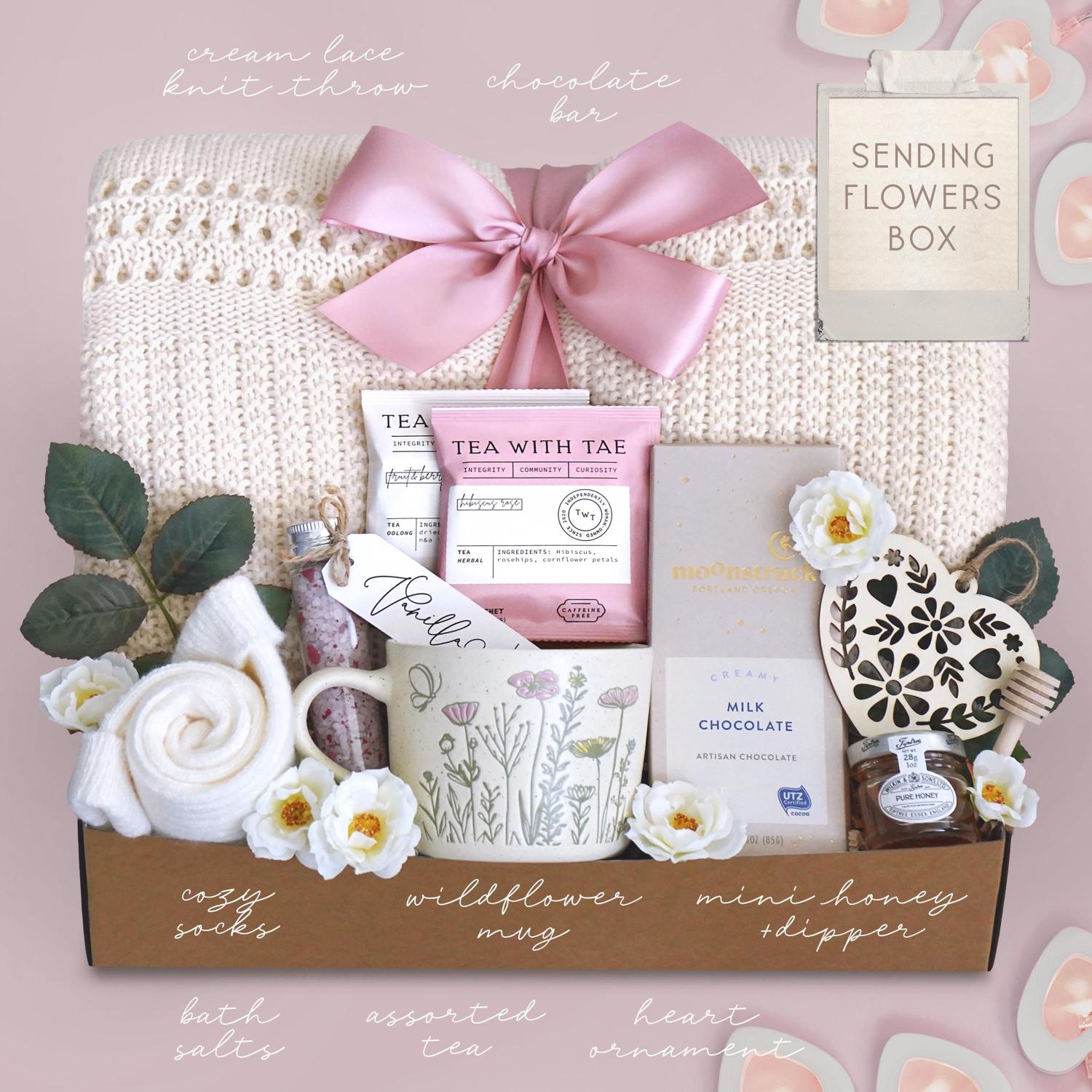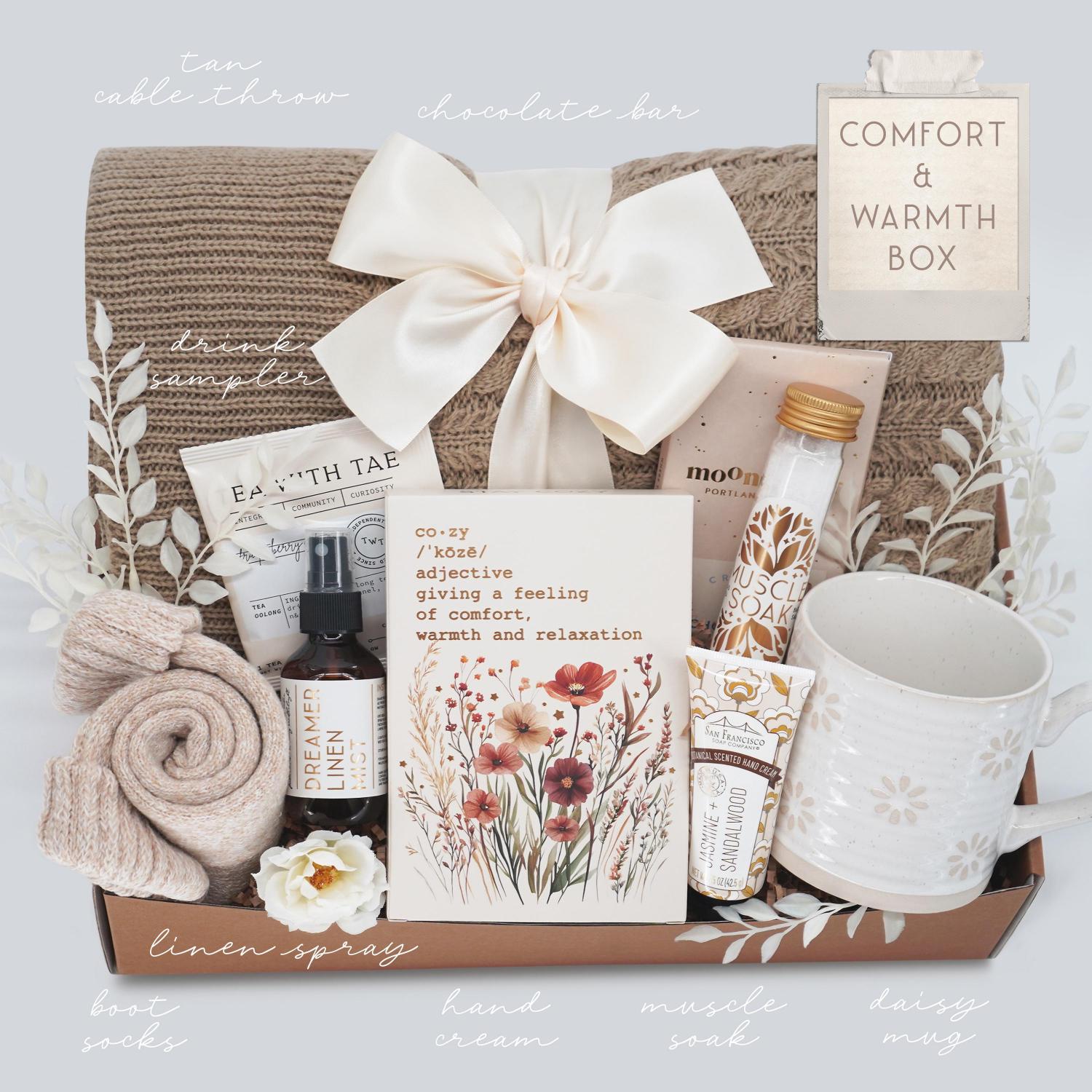 Each gift box is lovingly assembled with premium, comfort-focused items, and can be personalized to suit the recipient. Depending on the box style you choose, contents may include: A luxuriously soft blanket, perfect for cozy nights in; A ceramic mug for tea, coffee, or hot cocoa; Cozy socks, a scented candle, or a calming eye mask; Gourmet treats like hot chocolate, cookies, or artisanal tea; Every item is selected for its quality, comfort, and ability to bring a moment of peace and joy. Beautifully presented in a keepsake-worthy gift box, it's ready to be opened and loved.