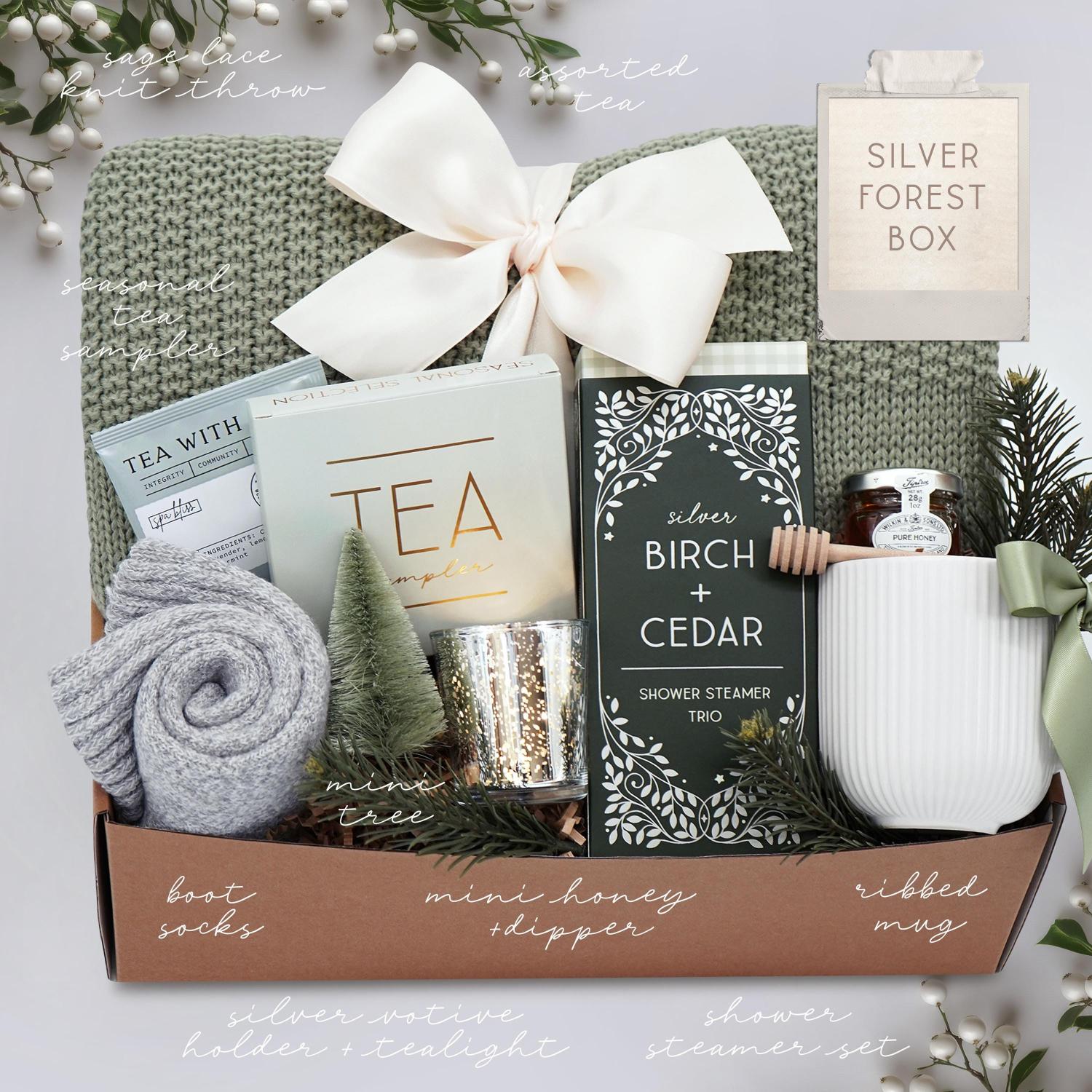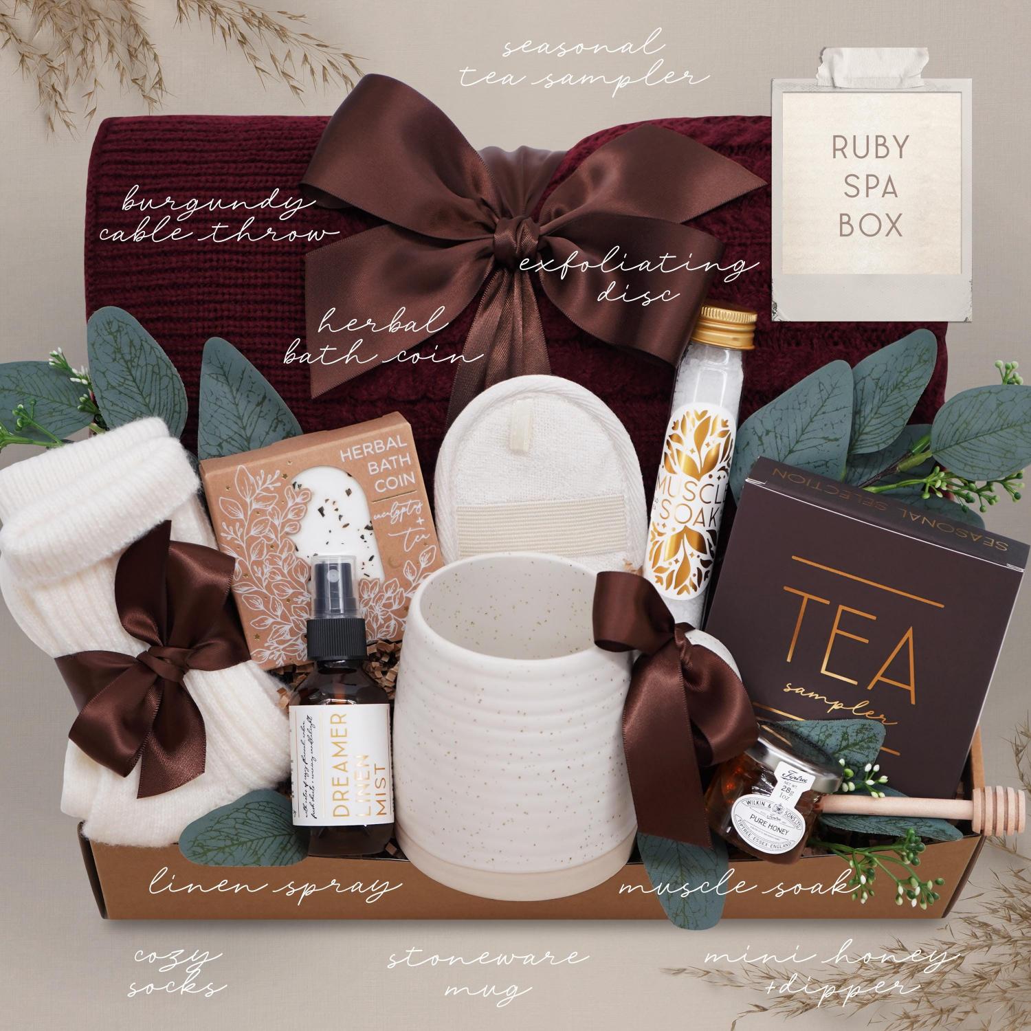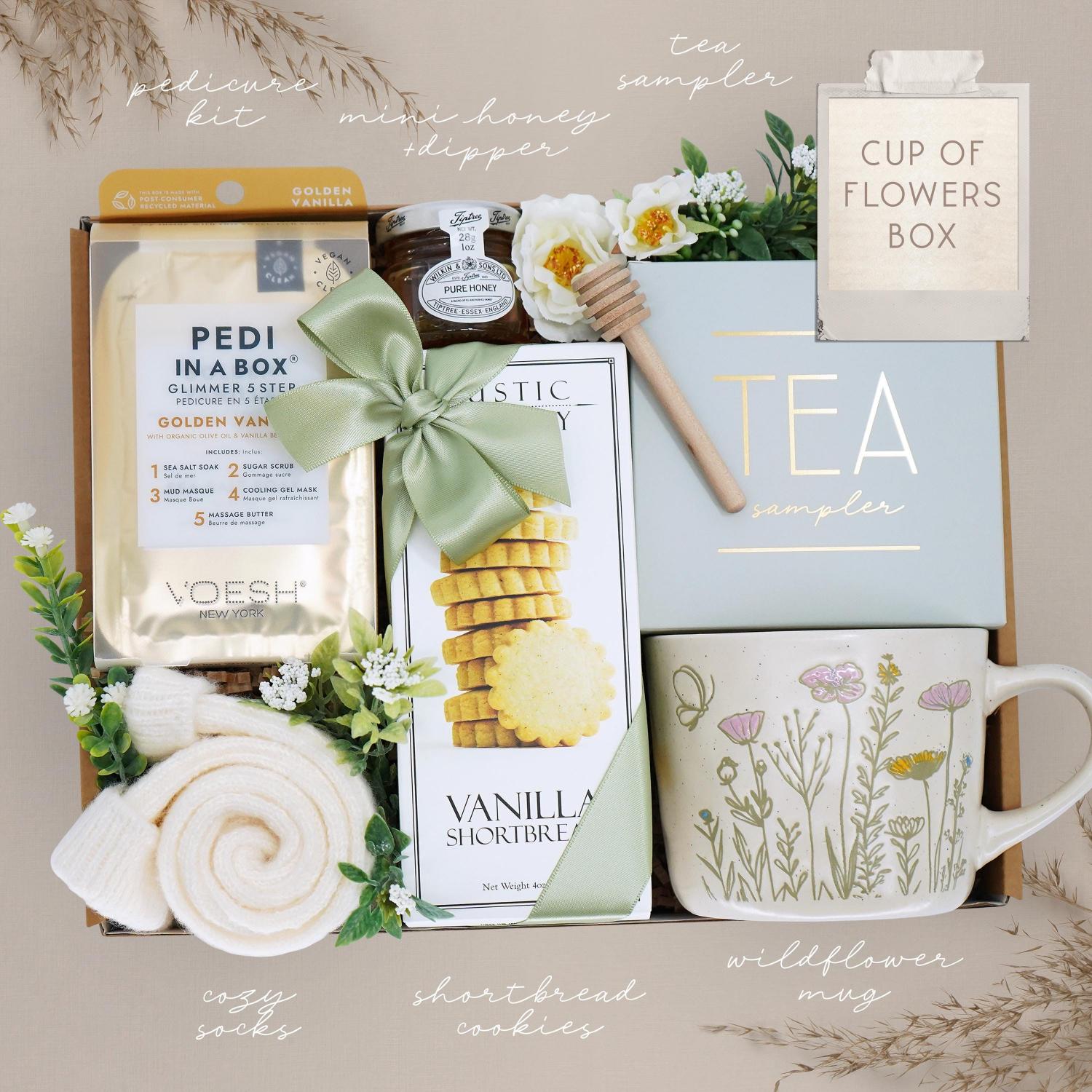 Each gift box is lovingly assembled with premium, comfort-focused items, and can be personalized to suit the recipient. Depending on the box style you choose, contents may include: A luxuriously soft blanket, perfect for cozy nights in; A ceramic mug for tea, coffee, or hot cocoa; Cozy socks, a scented candle, or a calming eye mask; Gourmet treats like hot chocolate, cookies, or artisanal tea; Every item is selected for its quality, comfort, and ability to bring a moment of peace and joy. Beautifully presented in a keepsake-worthy gift box, it's ready to be opened and loved.