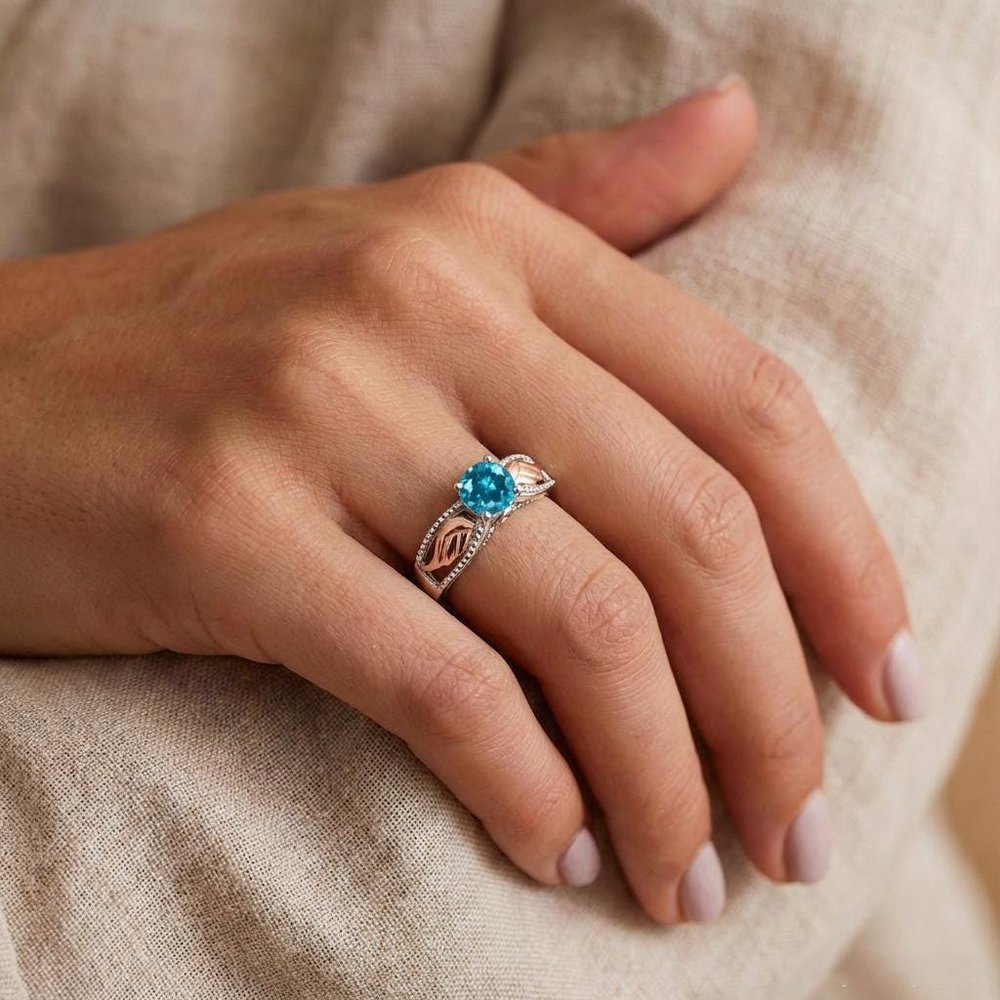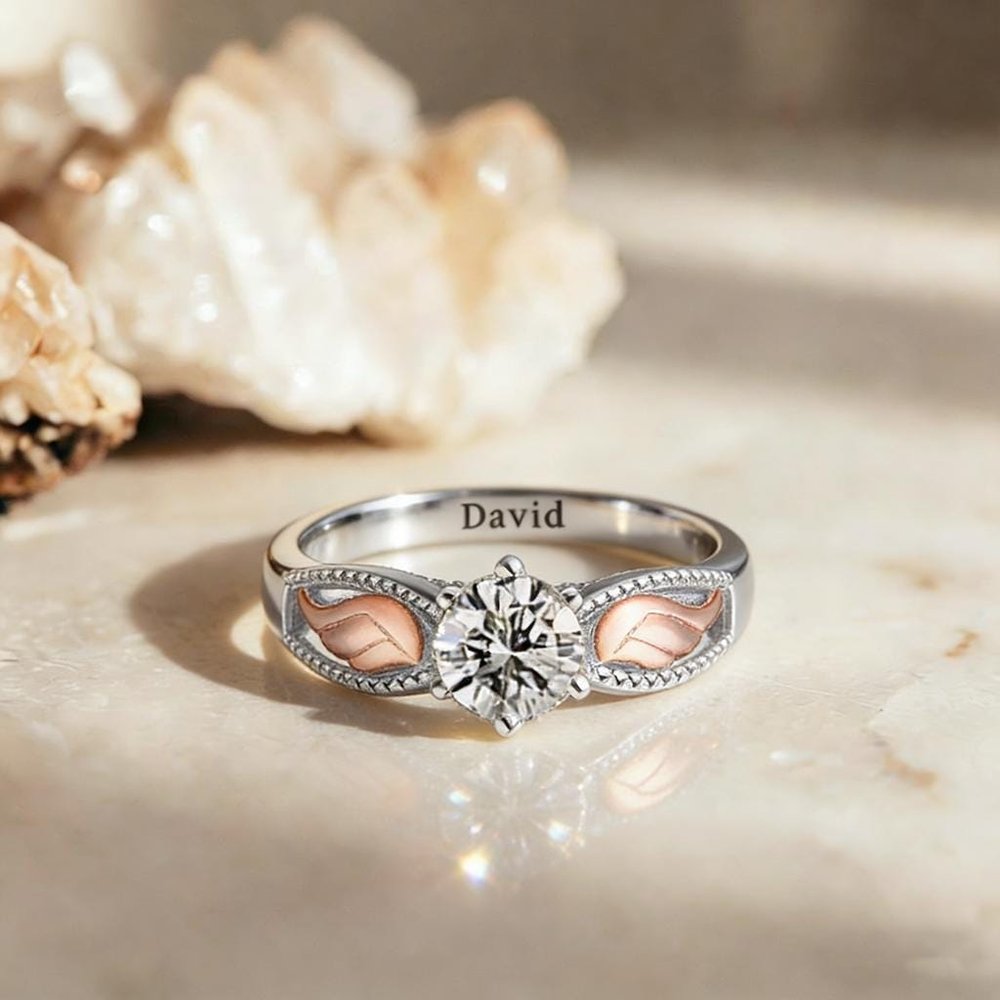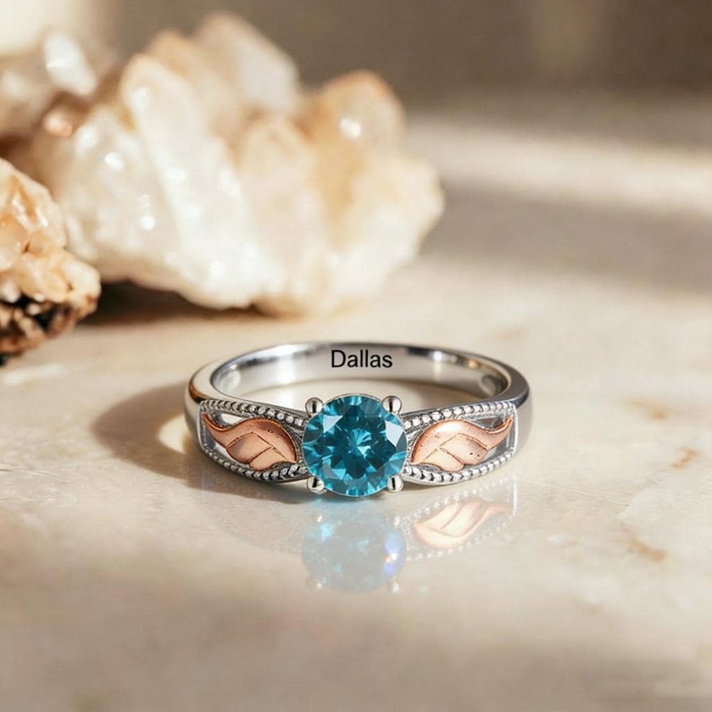 This exquisitely crafted ring features a brilliant center stone paired with delicate angel wing details in a warm rose gold tone, symbolizing protection, love, and the eternal bond with a cherished one. The birthstone centerpiece adds a deeply personal touch, representing the month of a loved oneβs birth or a meaningful date close to the heart.