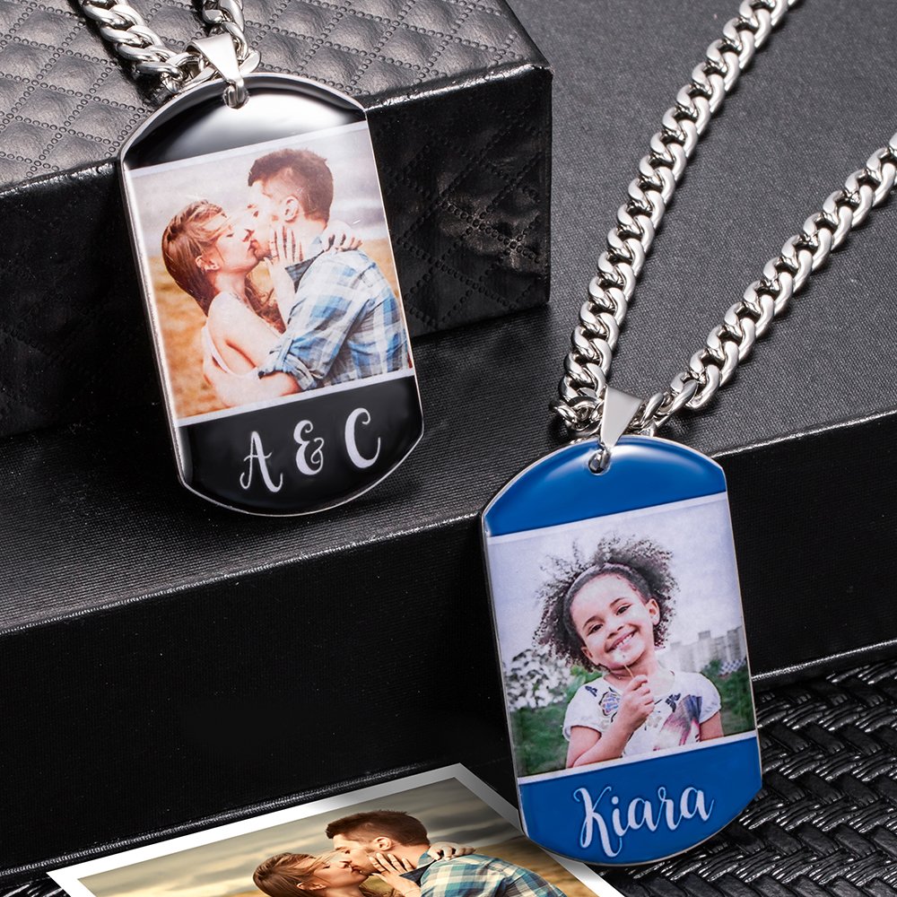 Capture your most cherished memories with this custom photo pendant feature. Simply upload your 1-4 favorite photos, whether they feature loved ones, pets, or special occasions, creating a one-of-a-kind accessory that tells your story. And also express yourself further by adding personalized text on both the front and back of the dog tag.