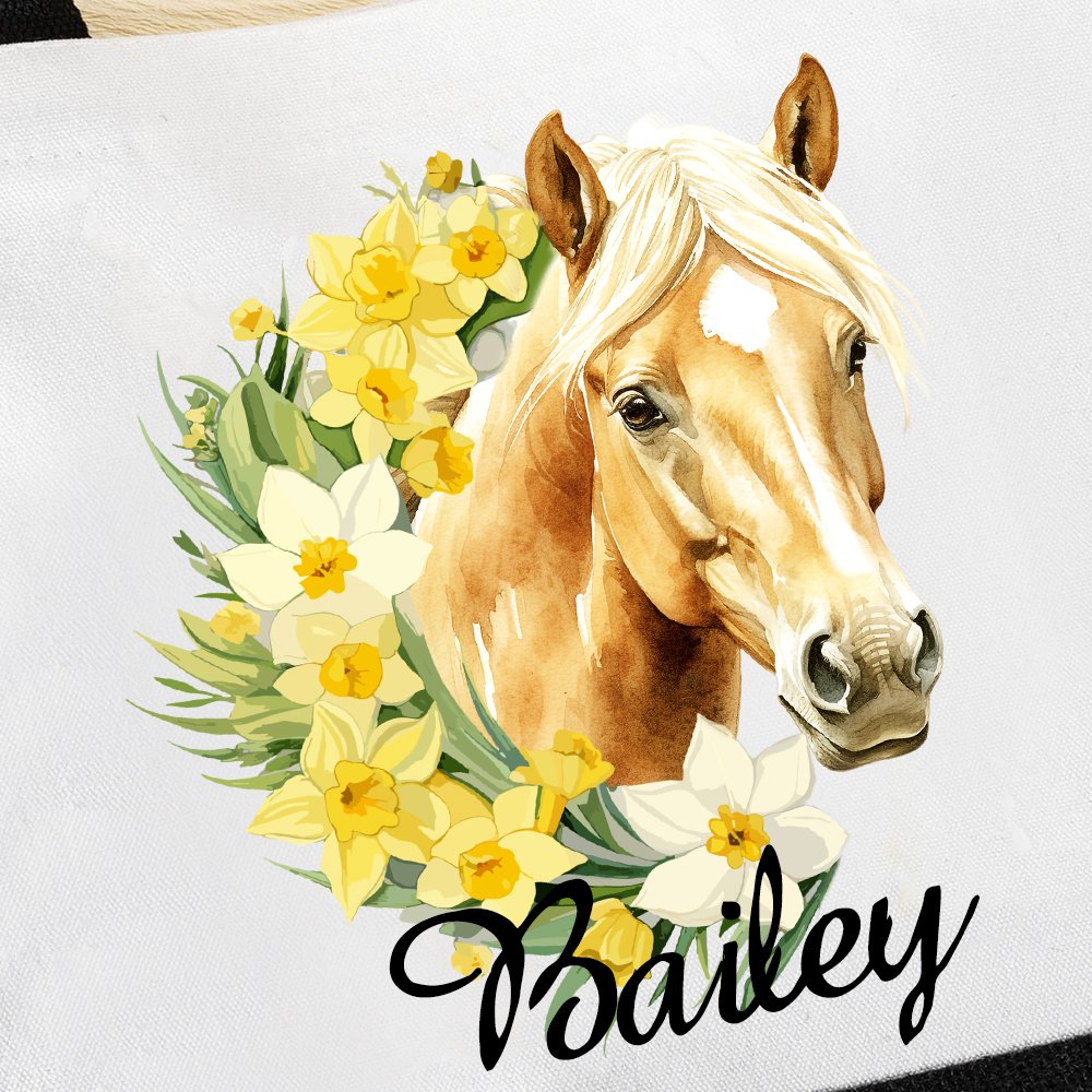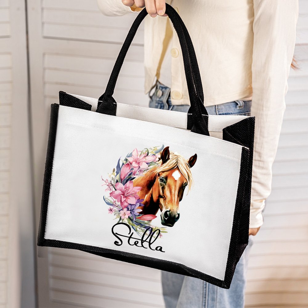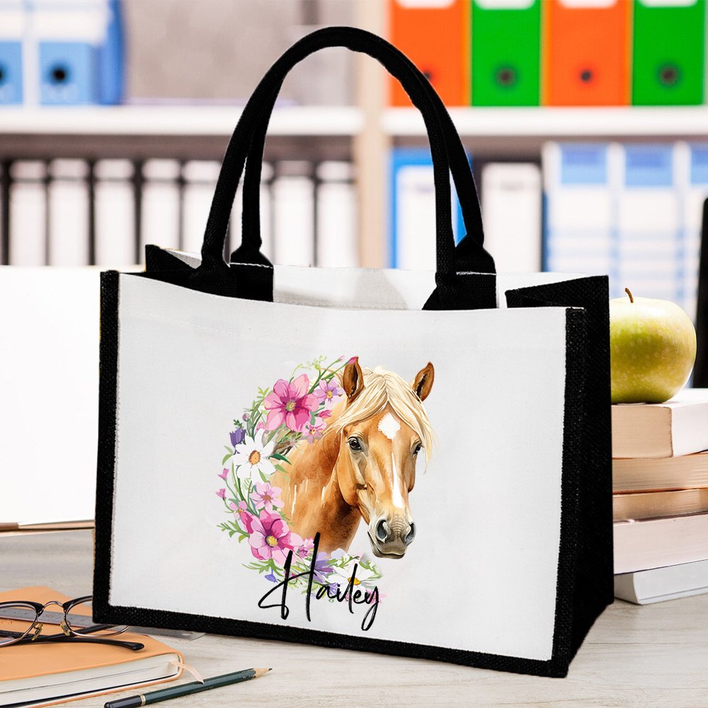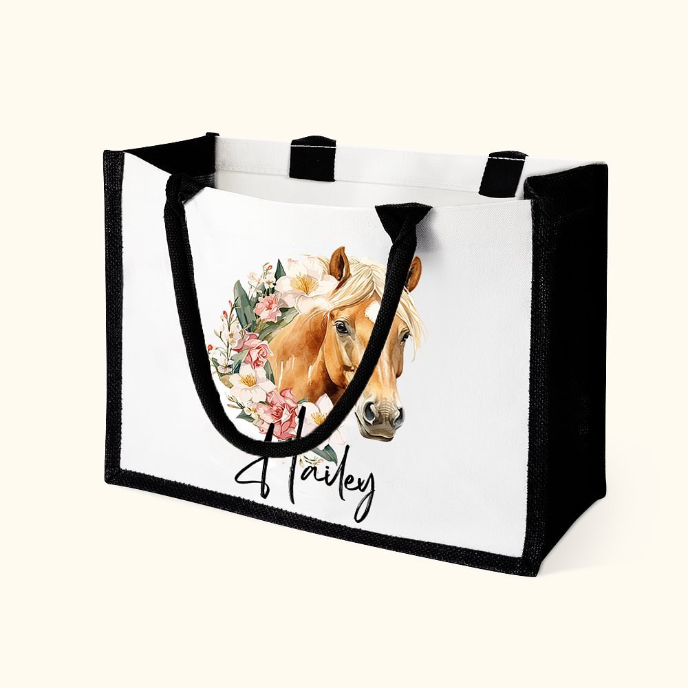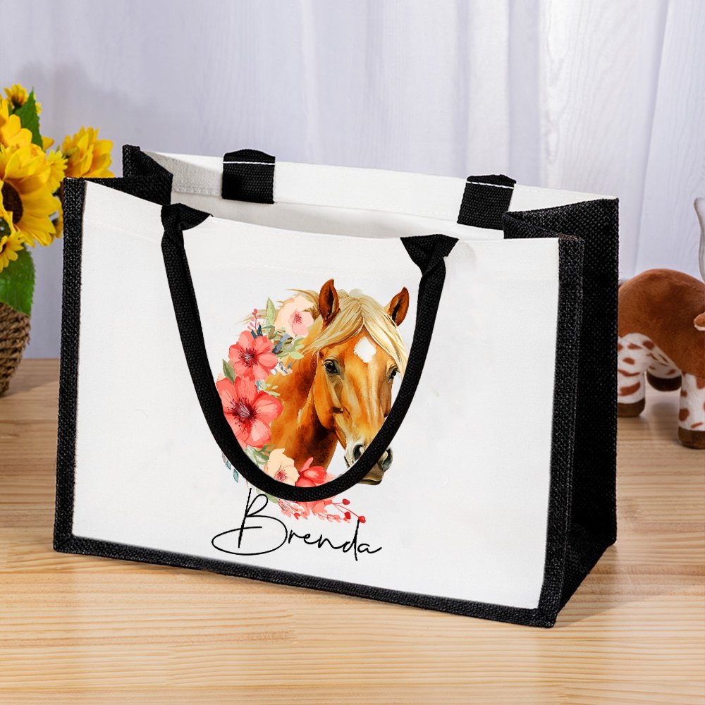 This reusable bag features a stunning combination of birth flower and horse pattern, creating a visually appealing and meaningful design. It is personalized with a name and adds a special touch that makes this bag unique. This thoughtful design transforms an everyday item into a cherished accessory, reflecting the owner's individuality and love for horses and nature.