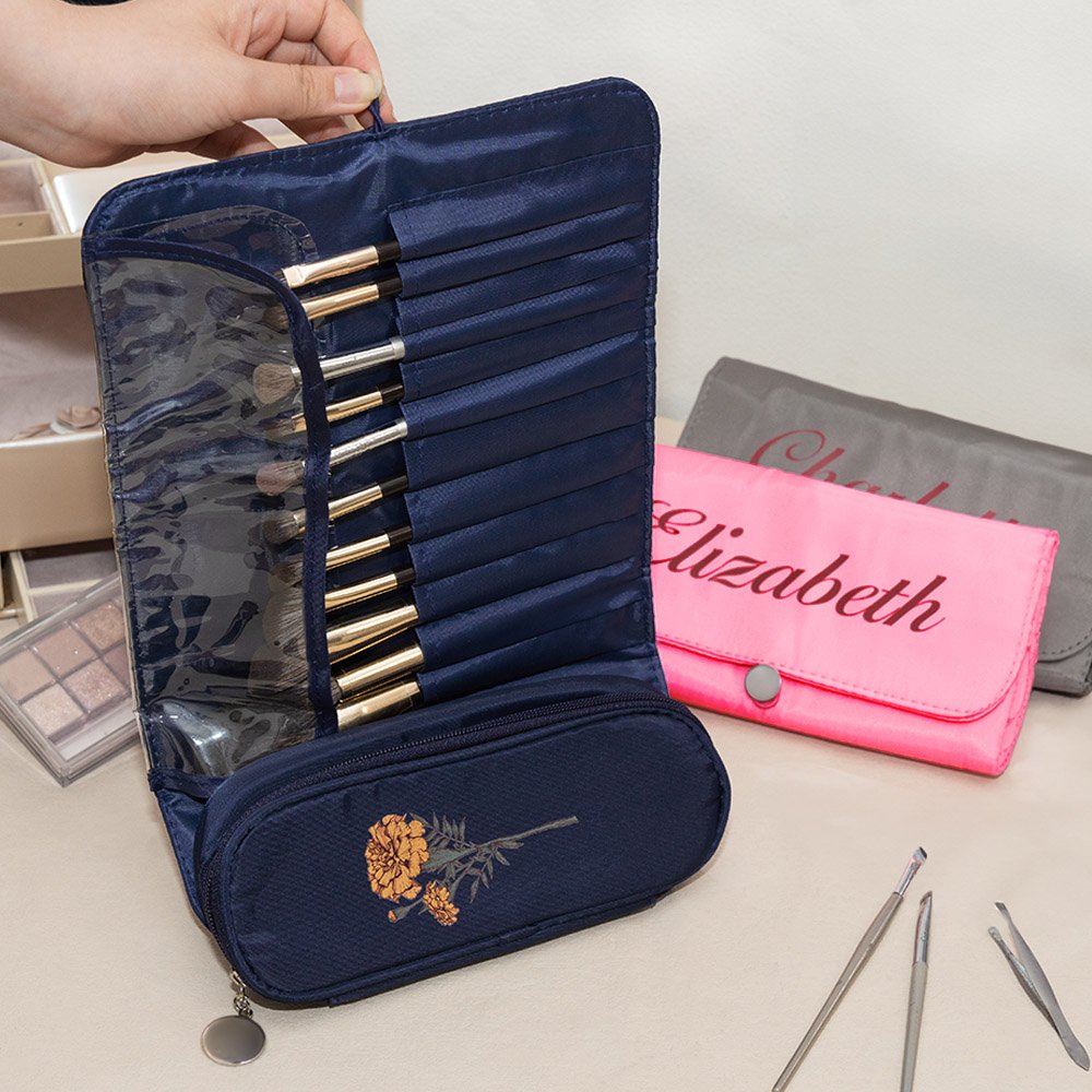 Personalized Birth Flower Waterproof Portable Makeup Brush Bag with Name Travel Essentials Birthday Gift for Women Makeup Artist