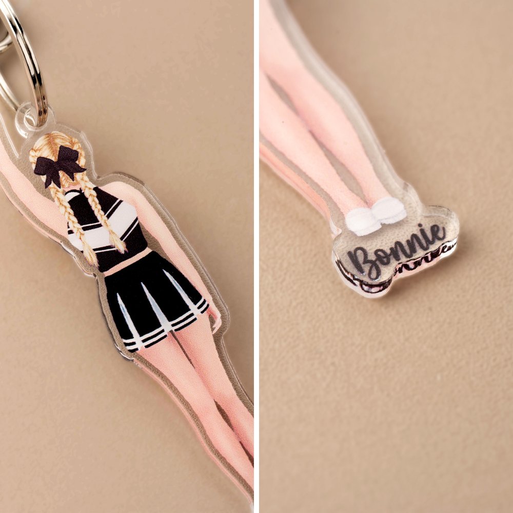 This keychain features a classic cheerleader silhouette as its central design, capturing the youthful energy and enthusiasm of cheerleaders in their iconic uniforms. Customizable names make each keychain unique, highlighting individual personalities.