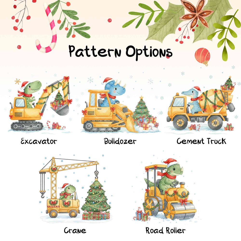 The cartoonish dinosaurs and bright construction trucks create a joyful, kid-friendly style. Snowflakes and holiday accents fill the background of the prints. Being able to tailor the bag with a childโs name, a meaningful year, and choose from fun dinosaur construction truck patterns turns a simple gift bag into a personalized experience.