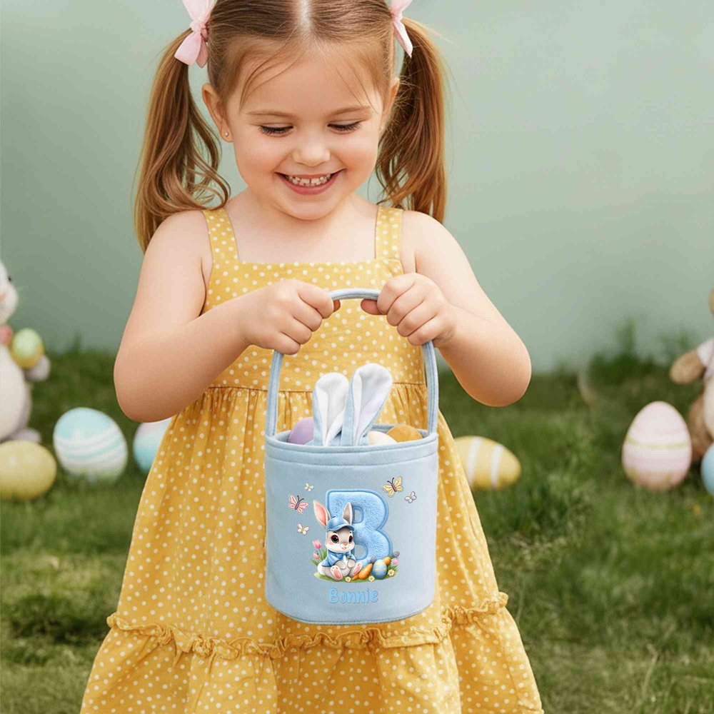 This Easter basket features an adorable bunny wearing a baseball cap, complemented by a plush-effect initial, carrots, flowers, butterflies, and 3D bunny ears, creating a vibrant and lively design that perfectly captures the Easter theme. A child's personalized name can be added for added personalization.