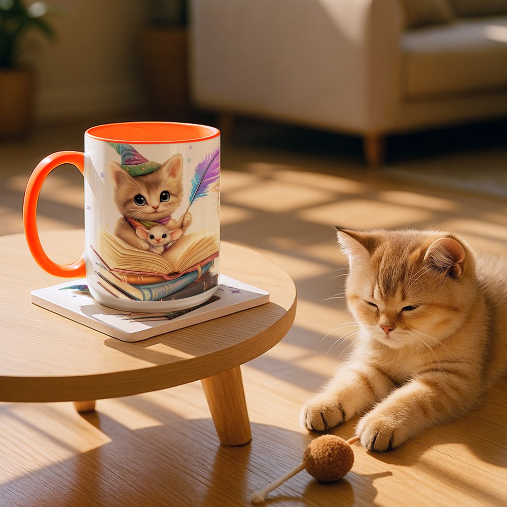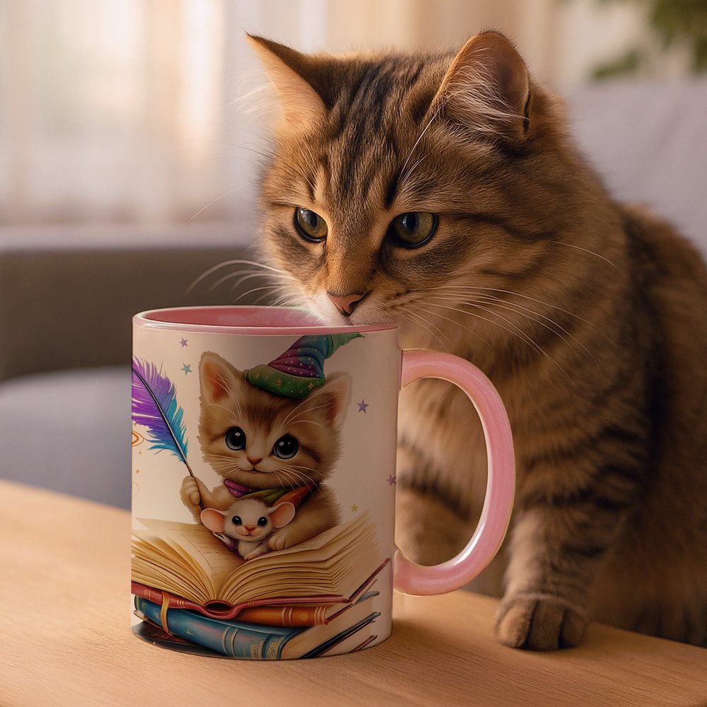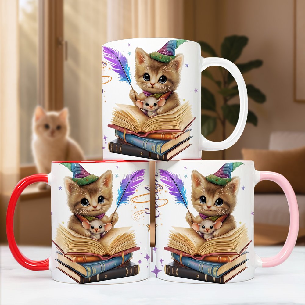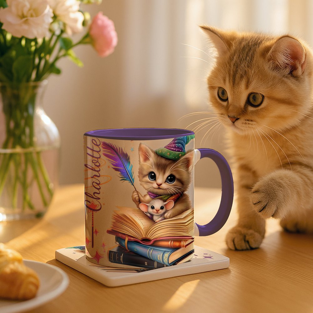 This mug features an adorable cartoon cat wearing a wizard hat, bringing a playful and vivid design to life. The cute cat is depicted cuddling a tiny mouse while holding a quill, perched atop an open book. This charming design full of whimsy will transport you to a magical fantasy world. The mug is available in multiple colors and can be personalized with your name, ensuring your mug becomes a one-of-a-kind keepsake.