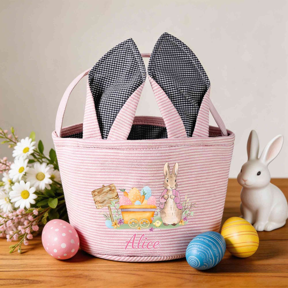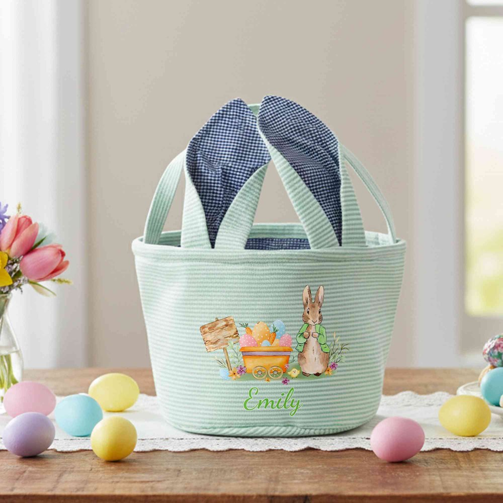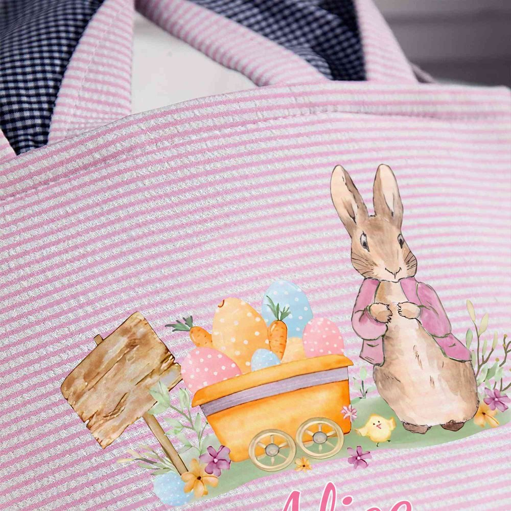 It offers delightful personalization to make every child’s holiday extra special. You can choose from a range of soft striped background colors and customize the front with a playful Peter Rabbit-style bunny illustration paired with a custom name, creating a one-of-a-kind basket that feels unique and stands out in any Easter celebration.