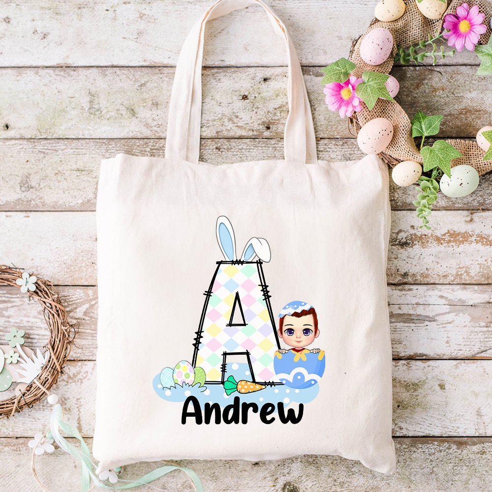 This canvas tote bag features a fun and festive Easter theme. Cartoon characters are hidden inside colorful Easter eggs. A cute bunny ears initial and a customizable name can be added to make it a one-of-a-kind gift. The playful design will bring joy to any child during Easter celebrations.