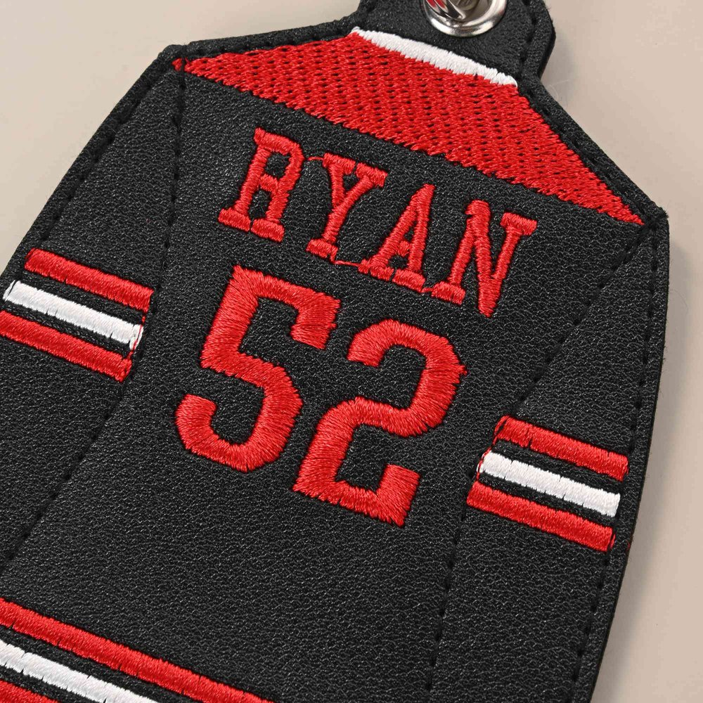 Handcrafted from high-quality, durable pu leather, this bag tag features the classic look of a hockey jersey. A custom name and number are carefully embroidered for a lasting, professional finish. Compact yet eye-catching, it's built to withstand the rink, the road, and every game day adventure.