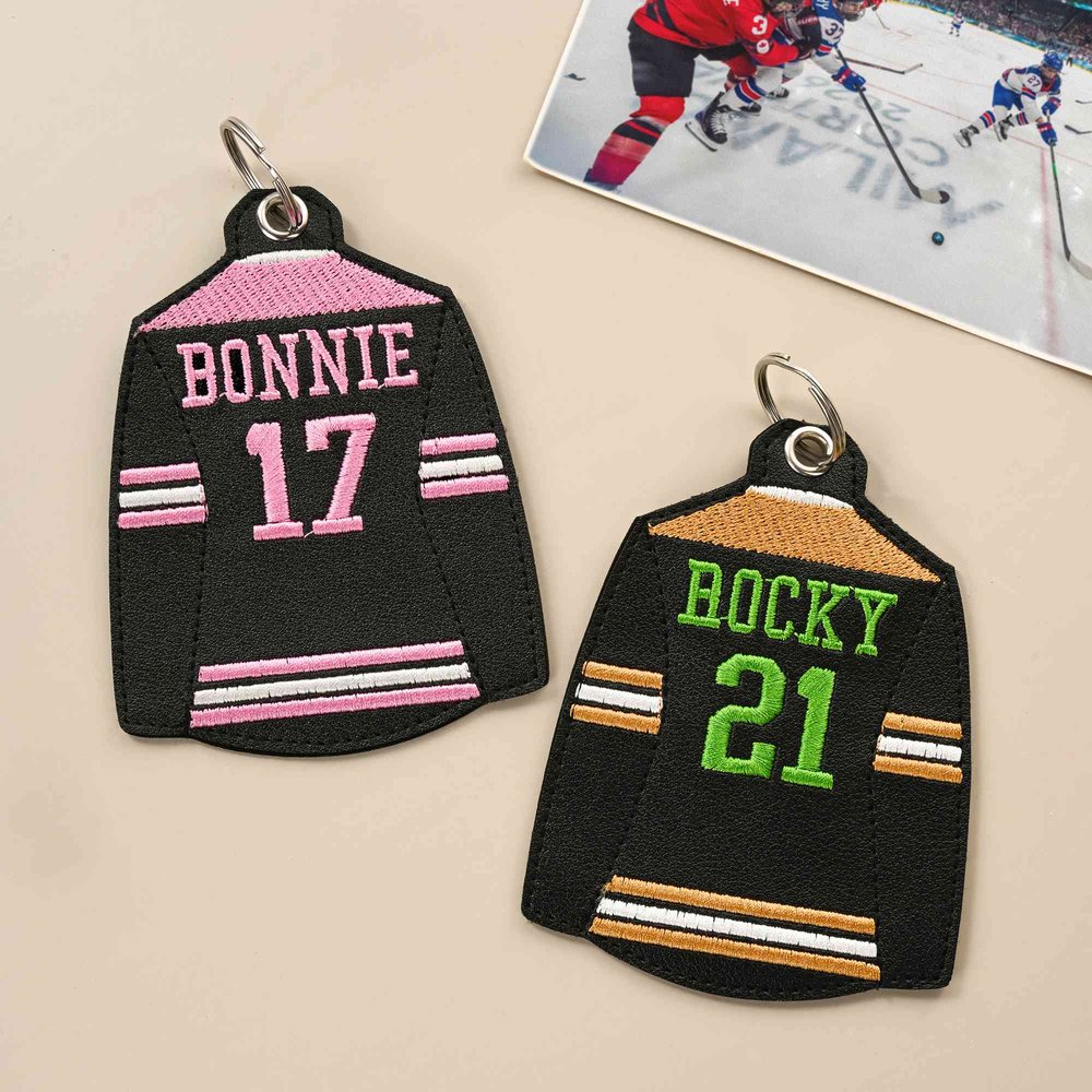 Personalized Embroidered Leather Hockey Jersey Bag Tag with Custom Name & Number, Hockey Team Key Ring Gift for Players & Coaches