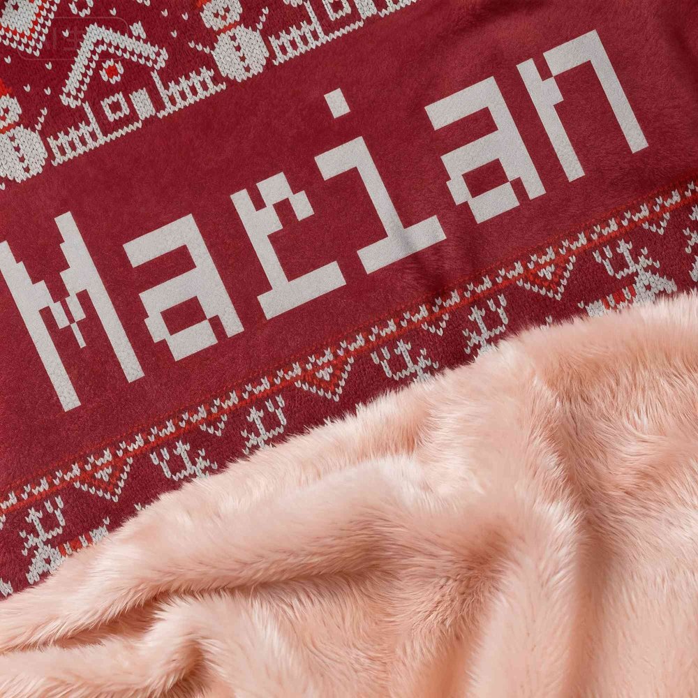 Designed for comfort with a soft fabric and a snug hood, it’s perfect for relaxing at home, traveling, or camping. Lightweight and easy to fold, it stores neatly anywhere. The beautiful Fair Isle-inspired patterns and personalized name make it not only a warm companion but also a lovely decorative accent that adds festive spirit to any space.