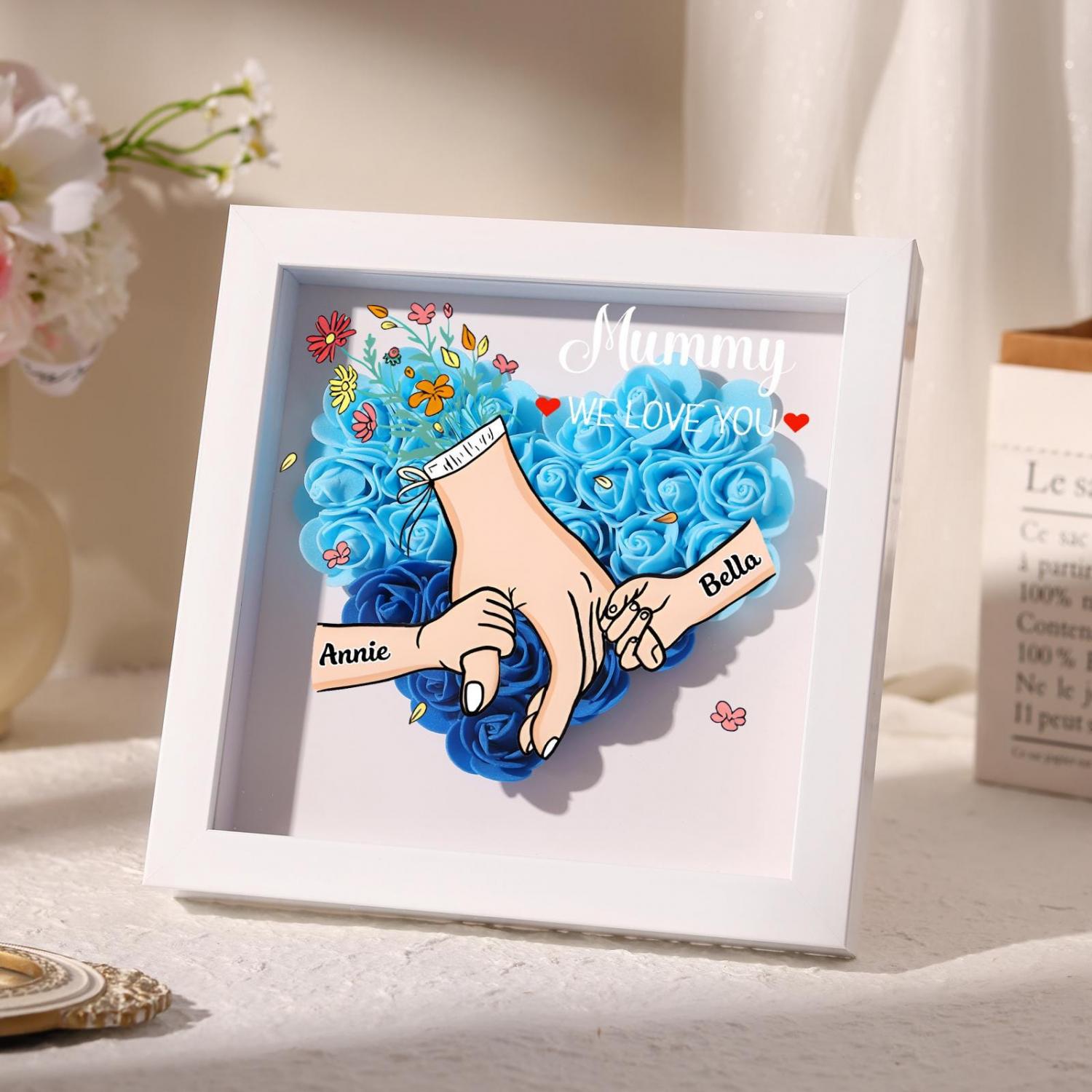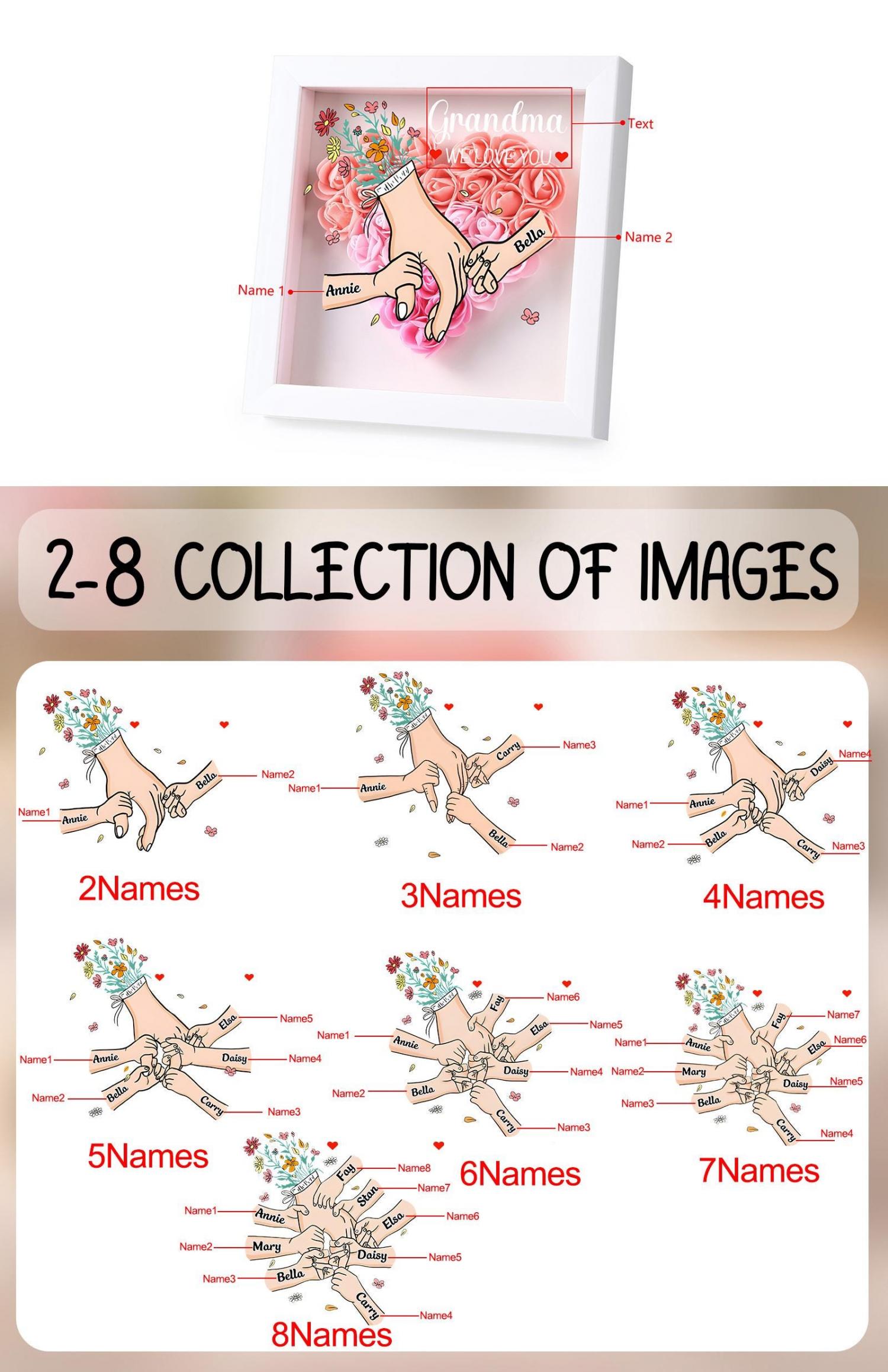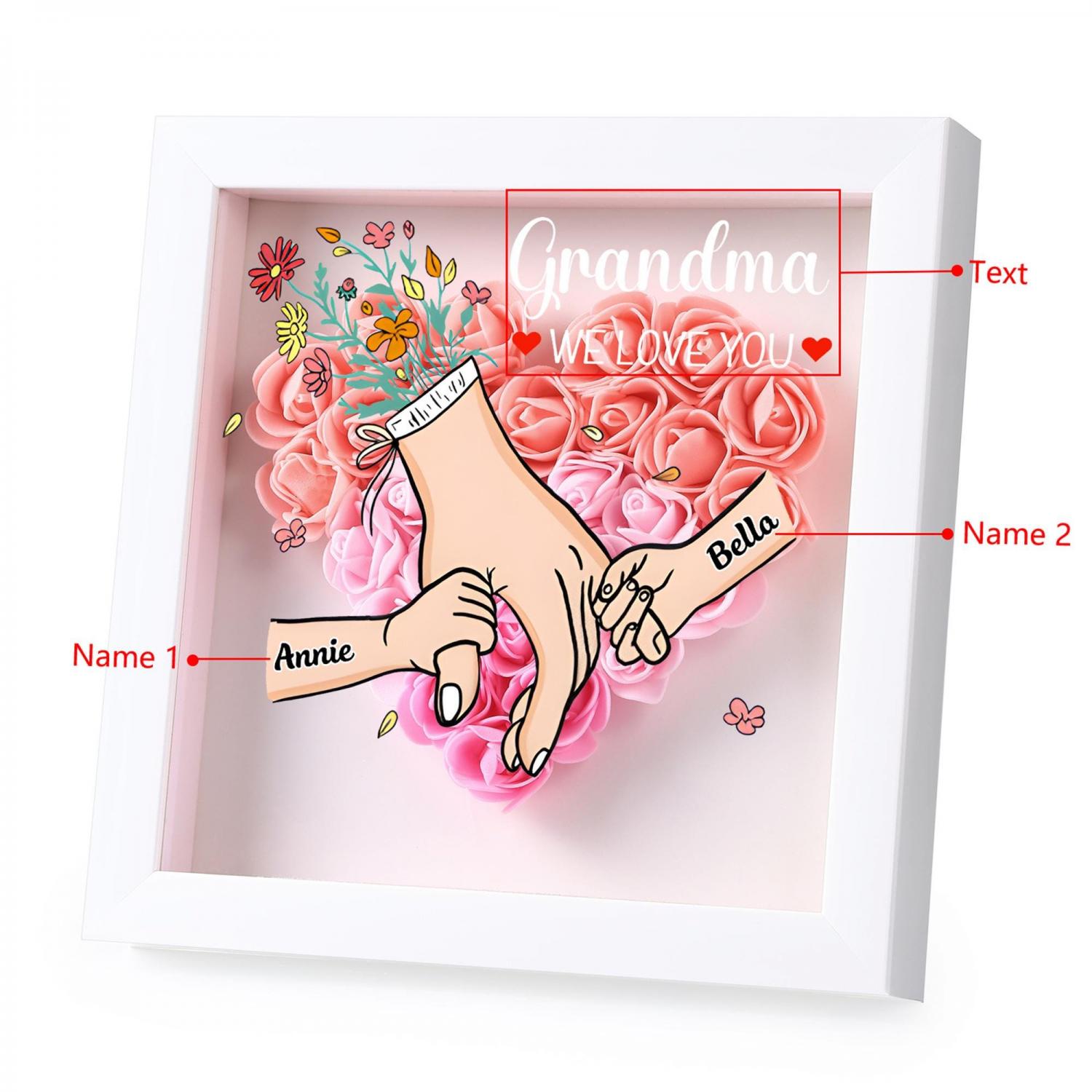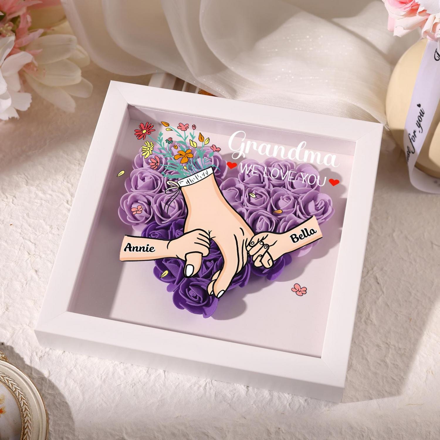This exquisite Personalized Holding Hands Flower Shadow Box features a tender, romantic design that celebrates the unbreakable bond between a grandma/mom and her grandchildren. The heart-shaped arrangement of vibrant roses, paired with the custom holding-hands illustration and heartfelt text like “Grandma WE LOVE YOU,” turns cherished memories into a timeless work of art that honors her role in your life.