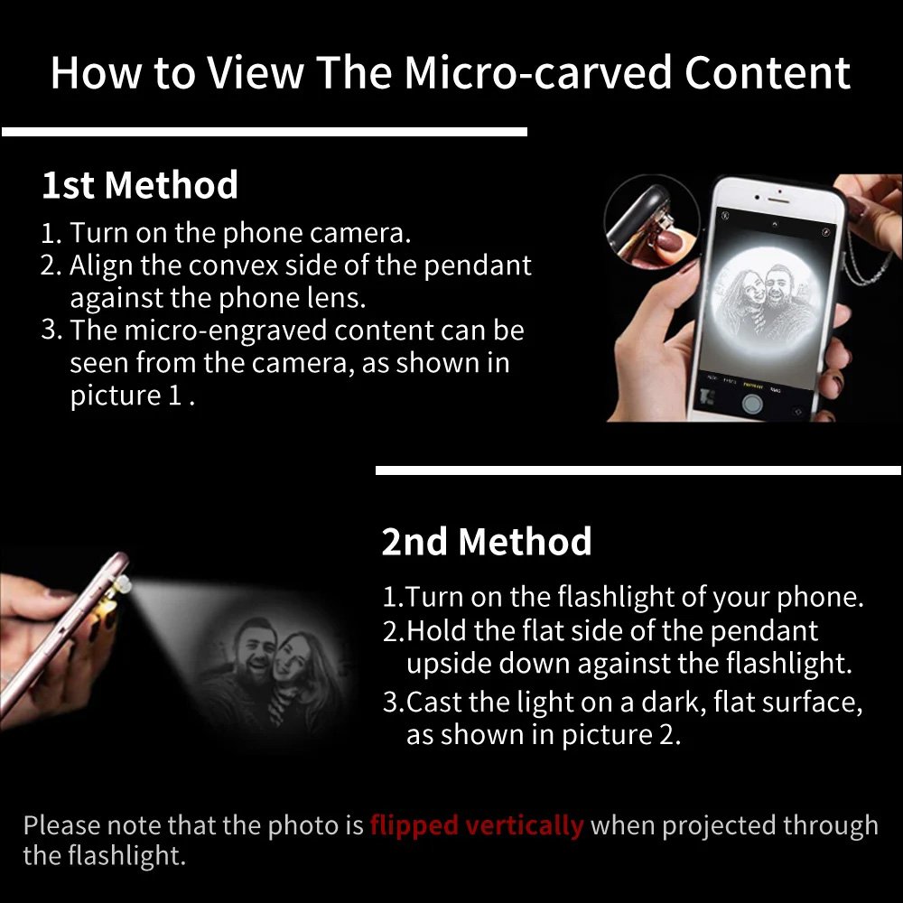 ​1st Method - 1. Turn on the phone camera. 2. Align the convex side of the pendant against the phone lens. 3. The micro-engraved content can be seen from the camera.​