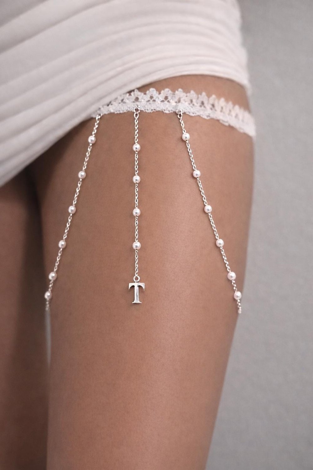 Personalized Initial Thigh Chain, Gold Pearl Bridal Garter with Custom Letter Pendant, Handcrafted Lace Leg Chain, Perfect Wedding Gift for Bride