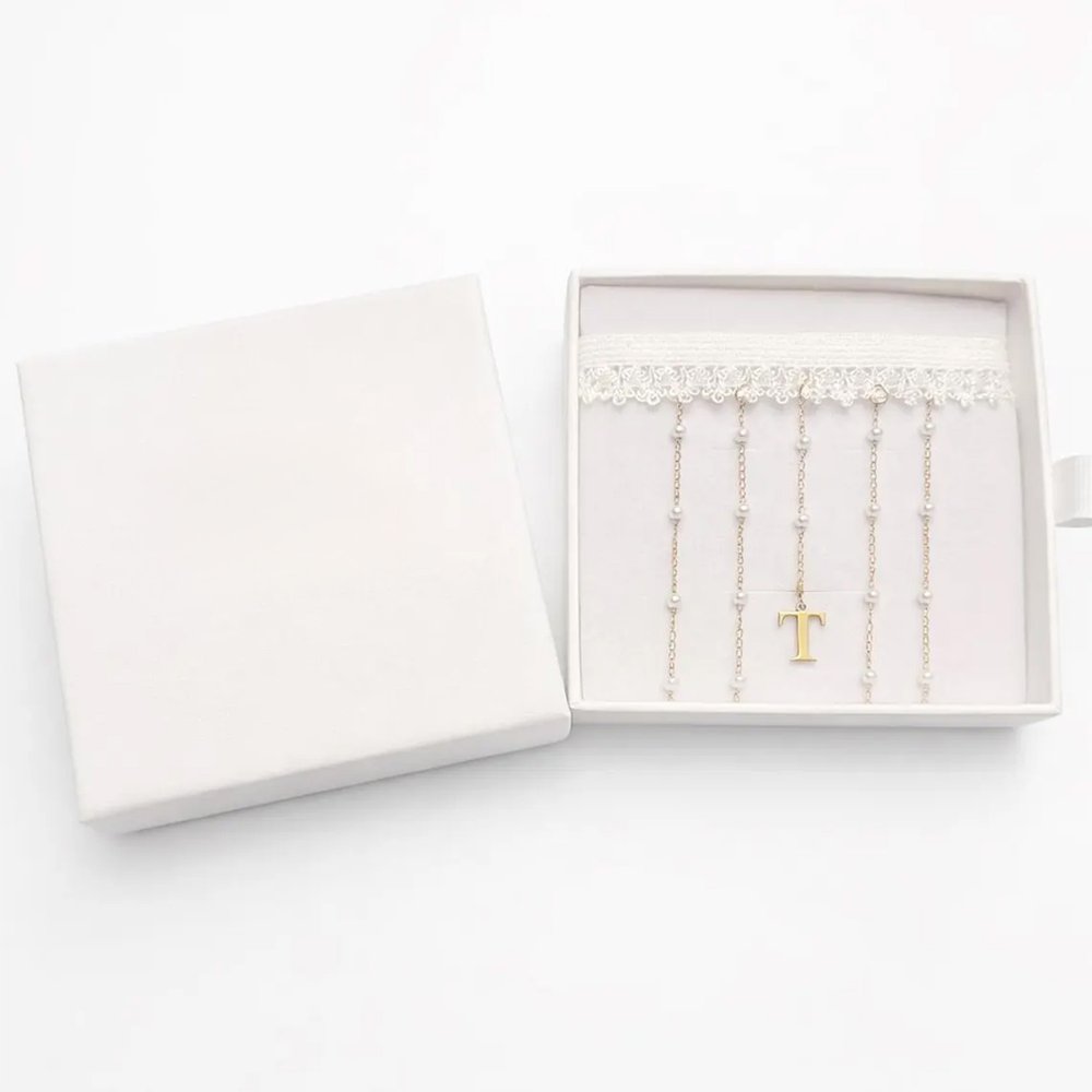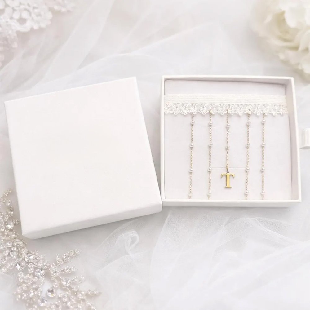 Featuring a polished gold initial pendant (like “T”), this piece can be personalized with the bride’s initial or a meaningful letter. This unique detail turns a beautiful accessory into a sentimental keepsake, perfect for commemorating her special day.