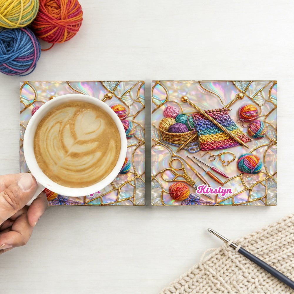 Crafted from high-quality, durable ceramic, this mug features a smooth glossy finish and a comfortable handle for everyday use. The knitting-inspired design includes adorable details like yarn balls, knitting needles all printed with fade-resistant ink. A custom name is beautifully displayed to make it uniquely hers. The matching coaster protects surfaces while completing the charming look.
