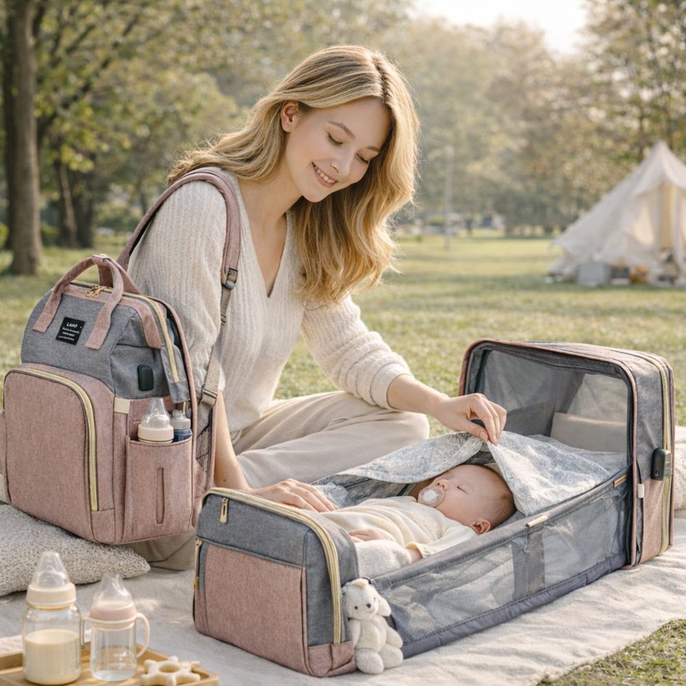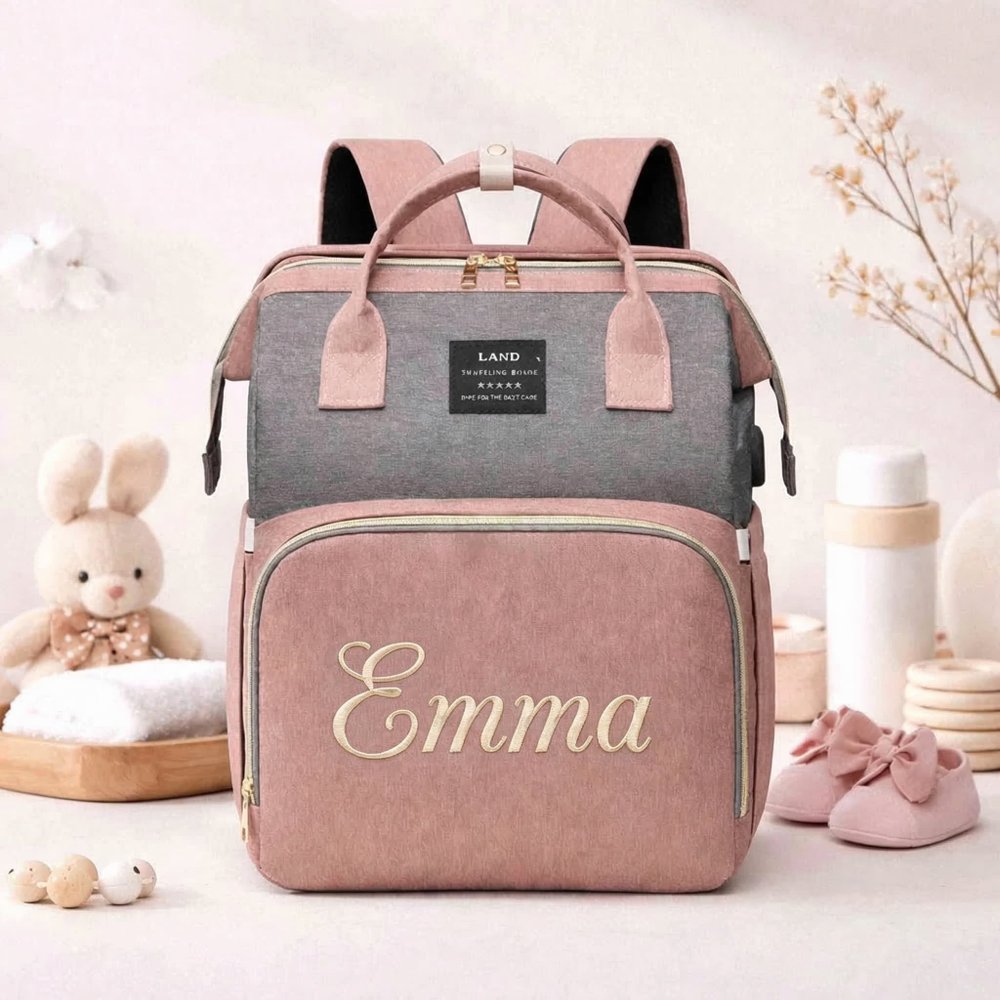 Personalized Large Capacity Diaper Backpack with Foldable Bed & Insulated Pockets, Waterproof Travel Backpack Gift for Mom & Dad