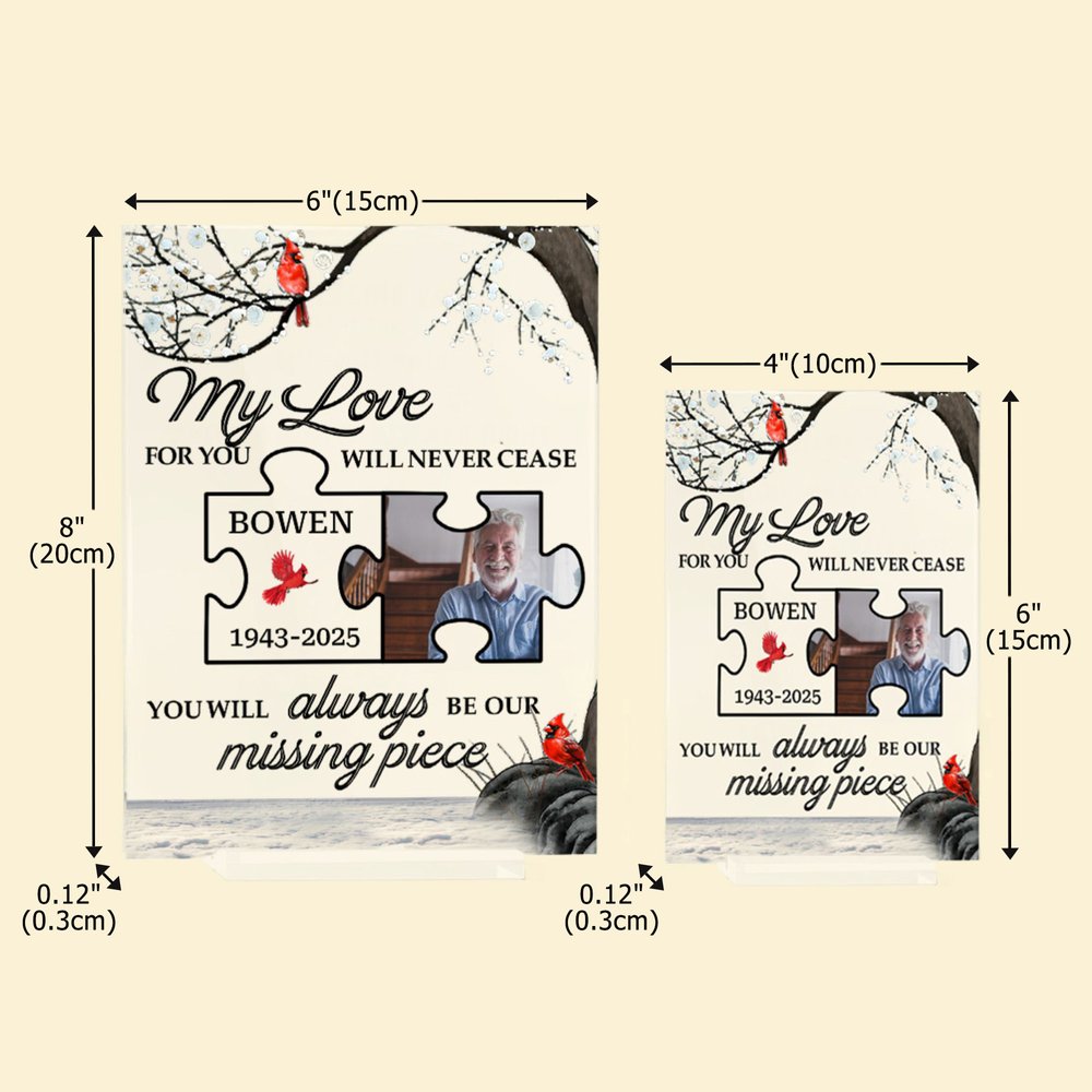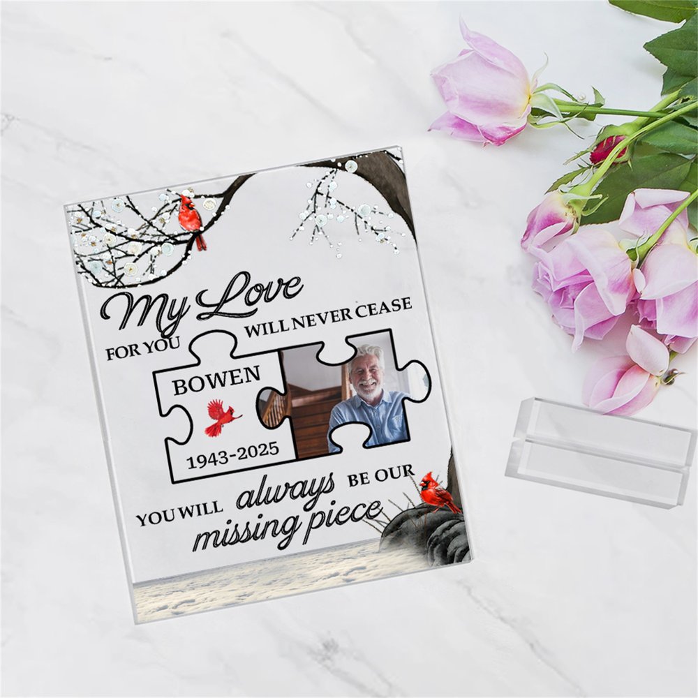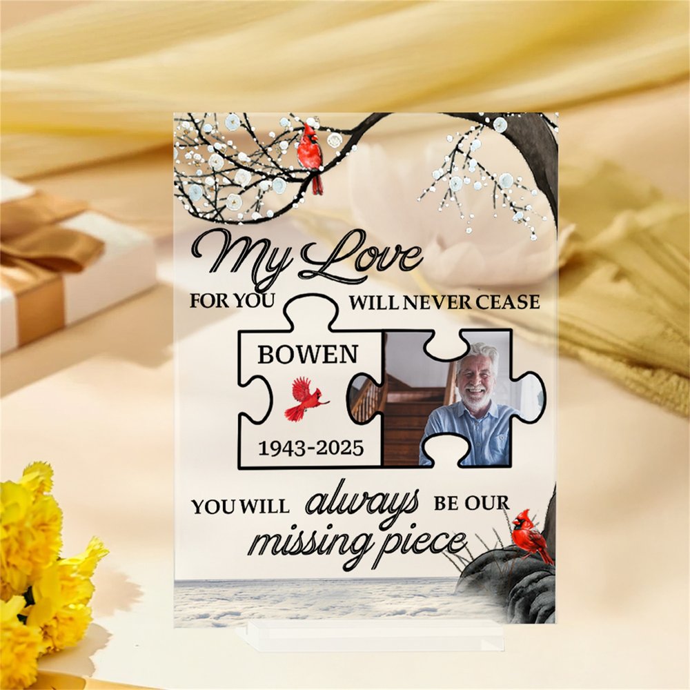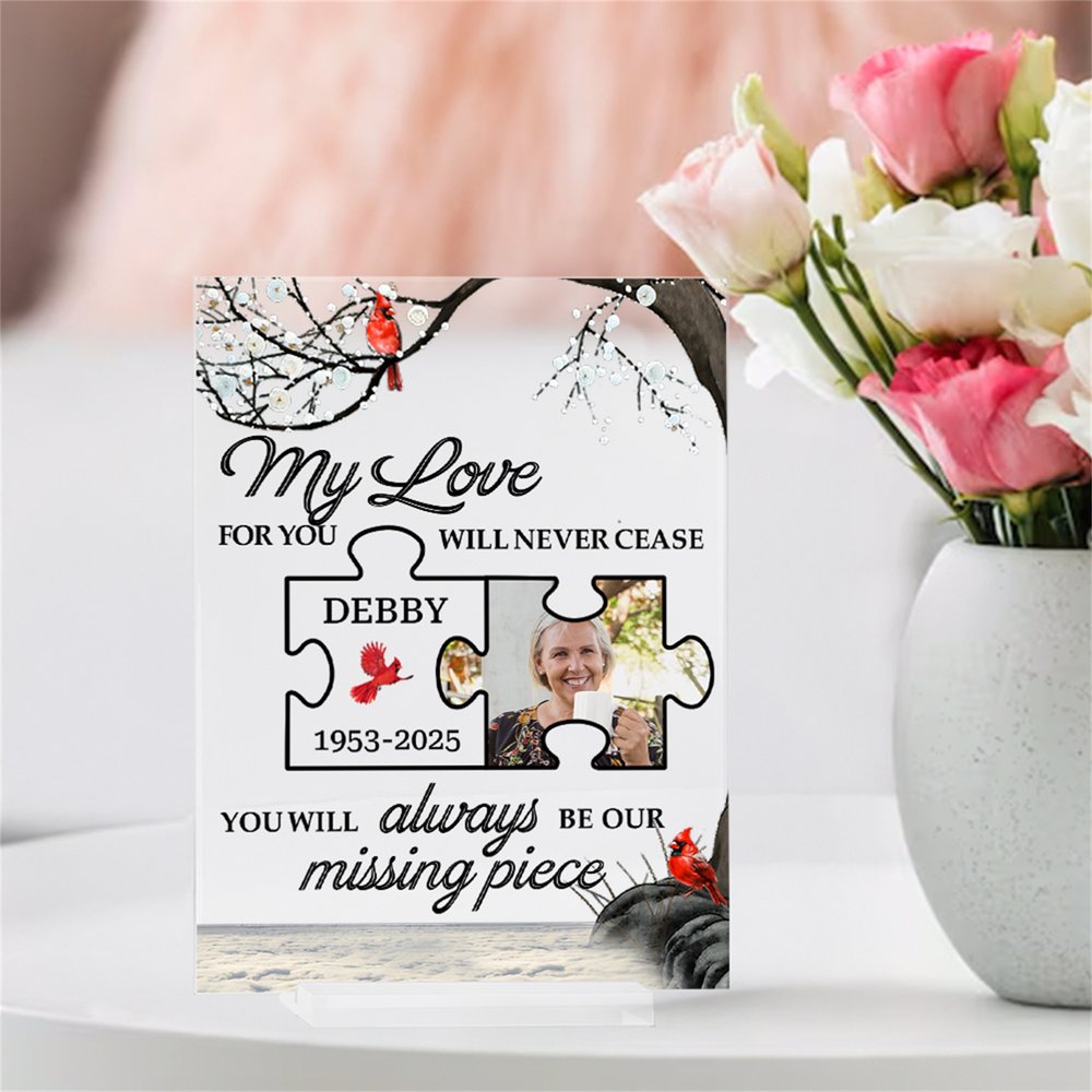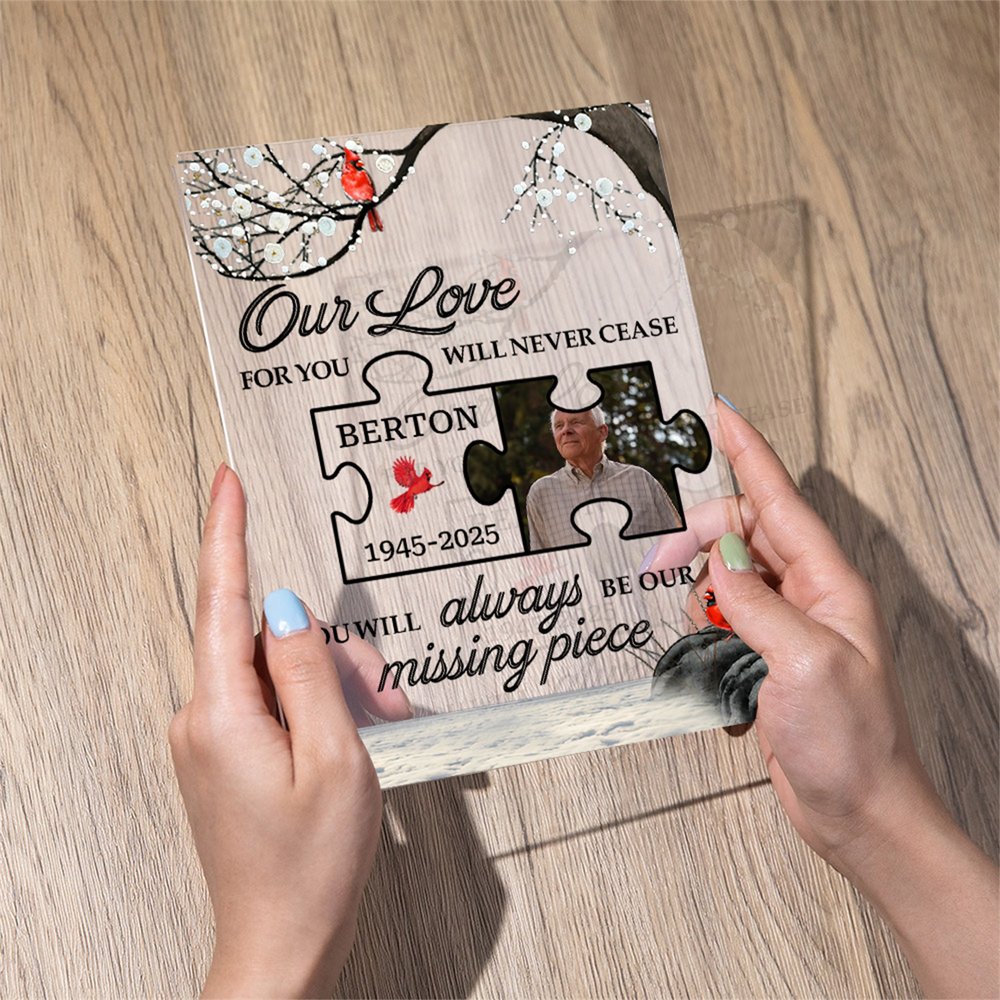 This acrylic plaque features a beautiful winter scene with a vibrant cardinal bird, symbolizing hope and remembrance. The design is customized with your loved one's name and years of birth and passing. The puzzle piece element adds a special touch - you can add a personal photo of your loved one to complete the design, creating a unique and personal tribute.