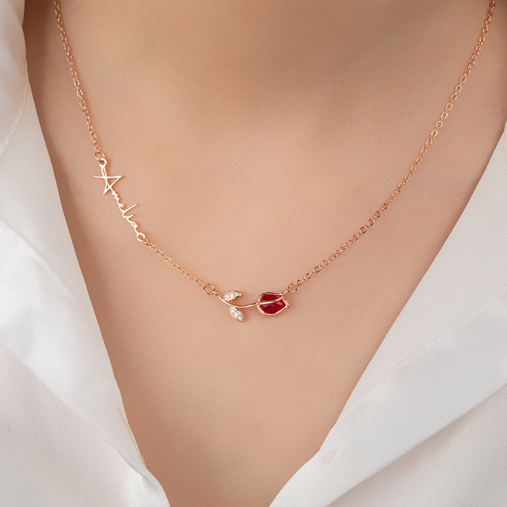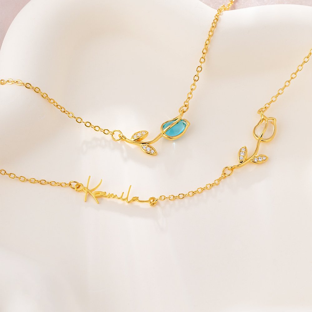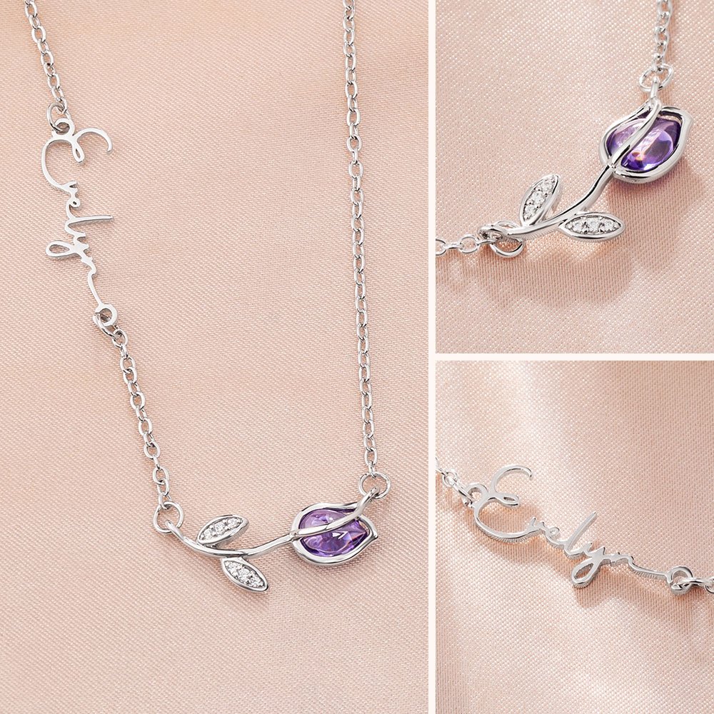 This stunning necklace showcases a beautifully crafted tulip pendant adorned with a birthstone, symbolizing beauty and grace. The sideways nameplate adds a trendy twist, transforming this piece into a standout addition to any jewelry collection.
