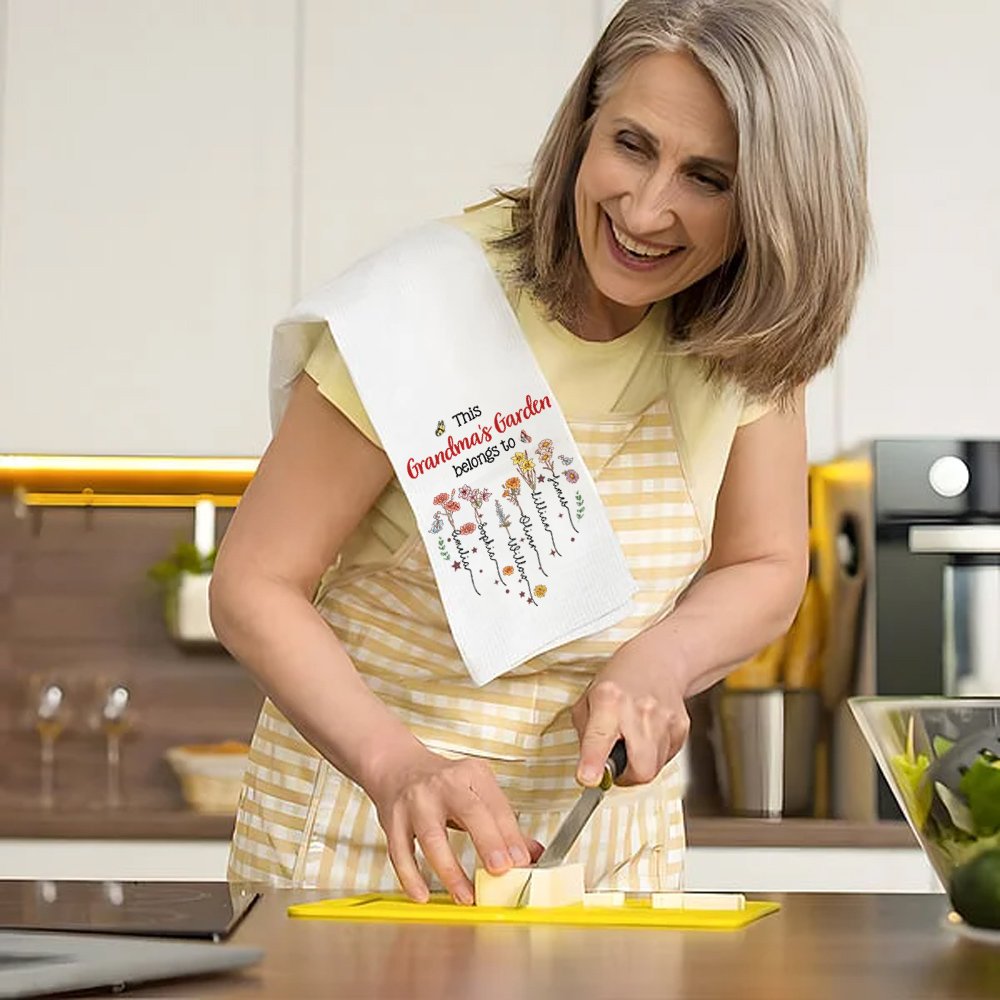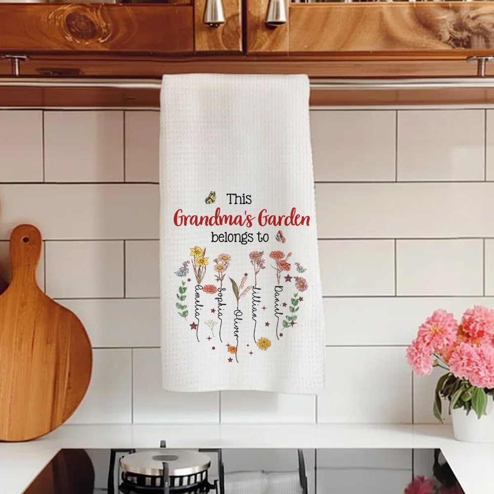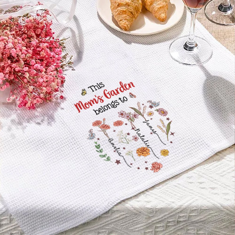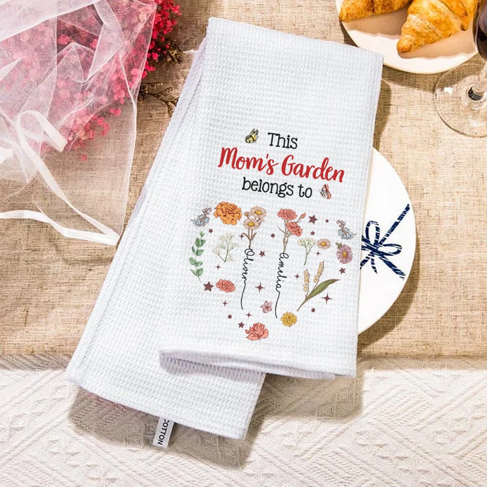 Personalized Mom's Garden Heart 1-12 Birth Flowers 100% Cotton Waffle Tea Towel with Names Kitchen Decor Birthday Mother's Day Gift for Mom Grandma