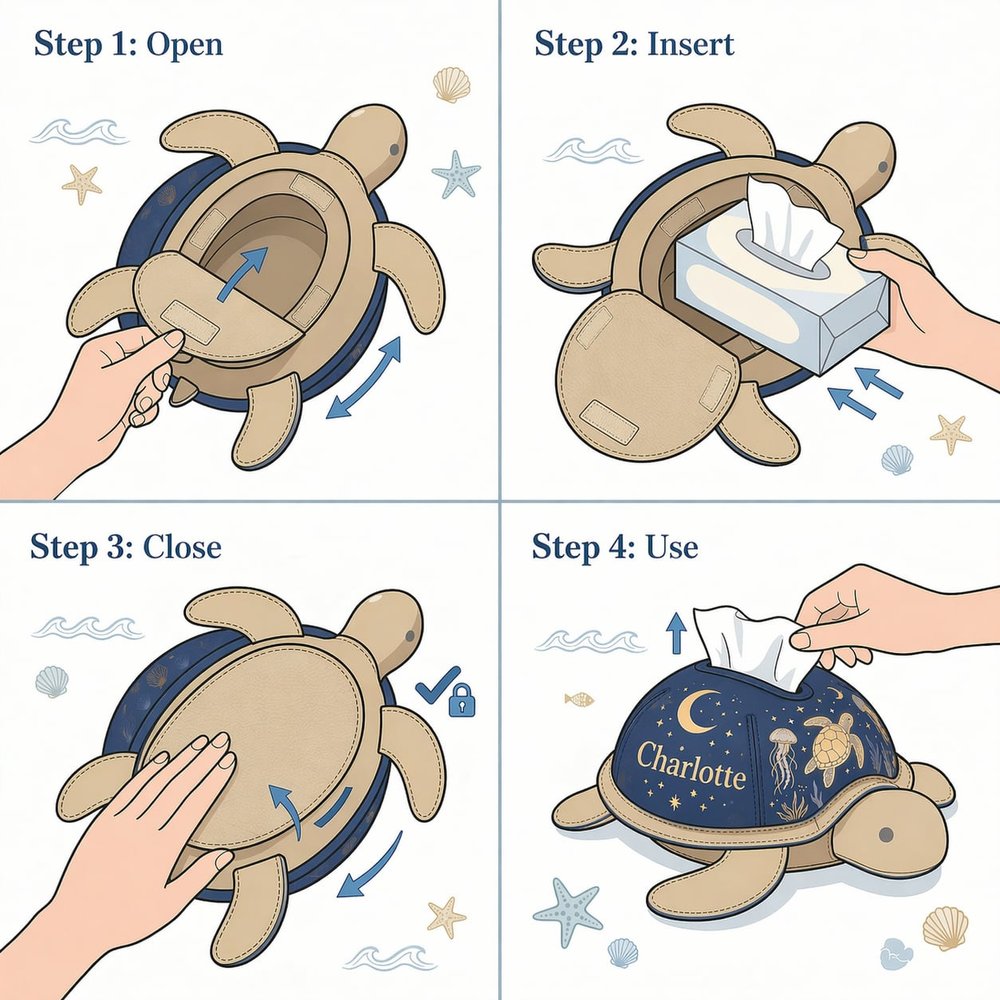 Crafted from soft, durable fabric with a smooth, leather-like feel, this tissue box cover is both stylish and practical. It is designed to fit standard square tissue boxes, with approximate dimensions of 30 cm (length) × 22 cm (width) × 12 cm (height). The high-definition flat print (non-embossed) ensures crisp, lasting details — from the turtle’s shell to the twinkling stars.