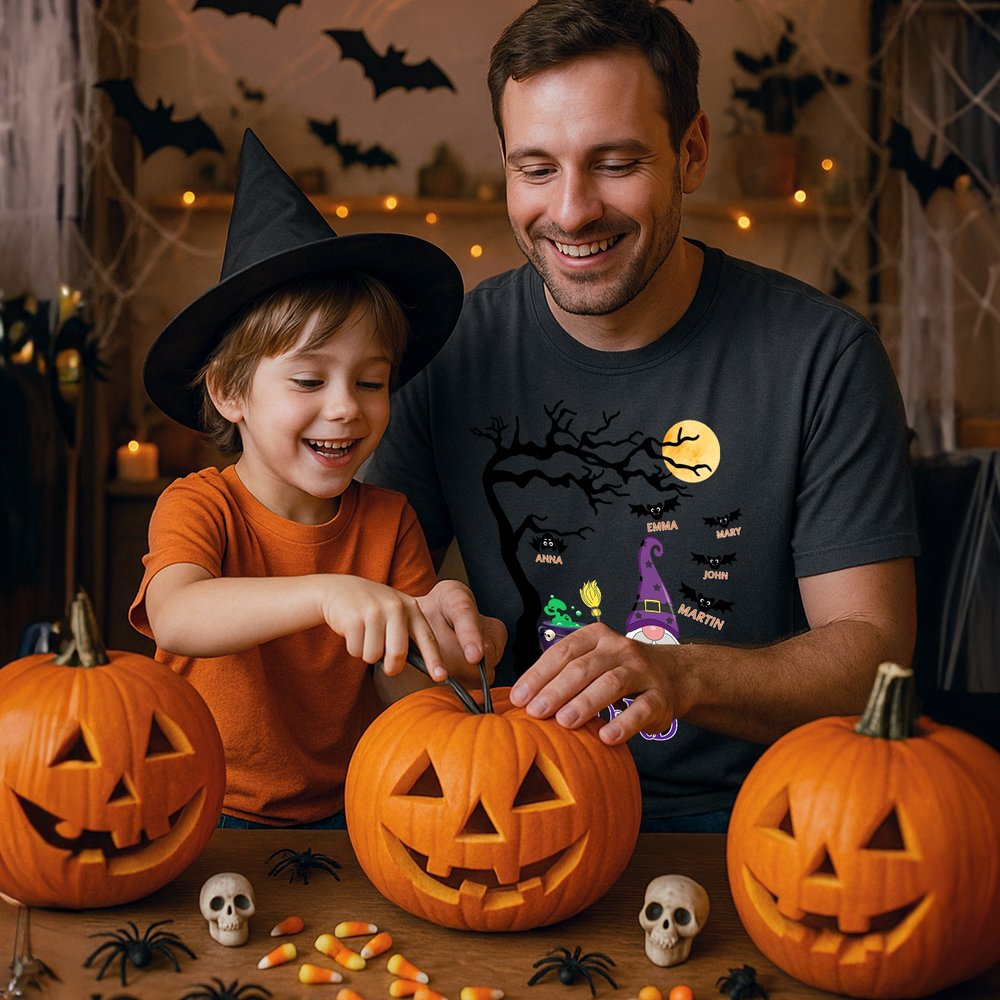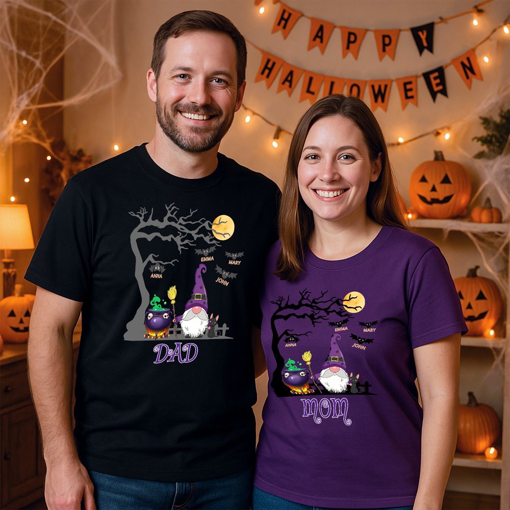 The T-shirt has a Halloween theme and is printed with elements such as witches, magic cauldrons, bats, the moon, and withered trees. The customized title and children's names are distributed among the patterns in eye-catching fonts, and the overall picture is full of the mysterious and joyful atmosphere of Halloween.