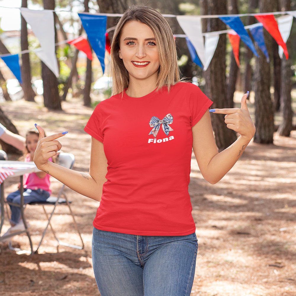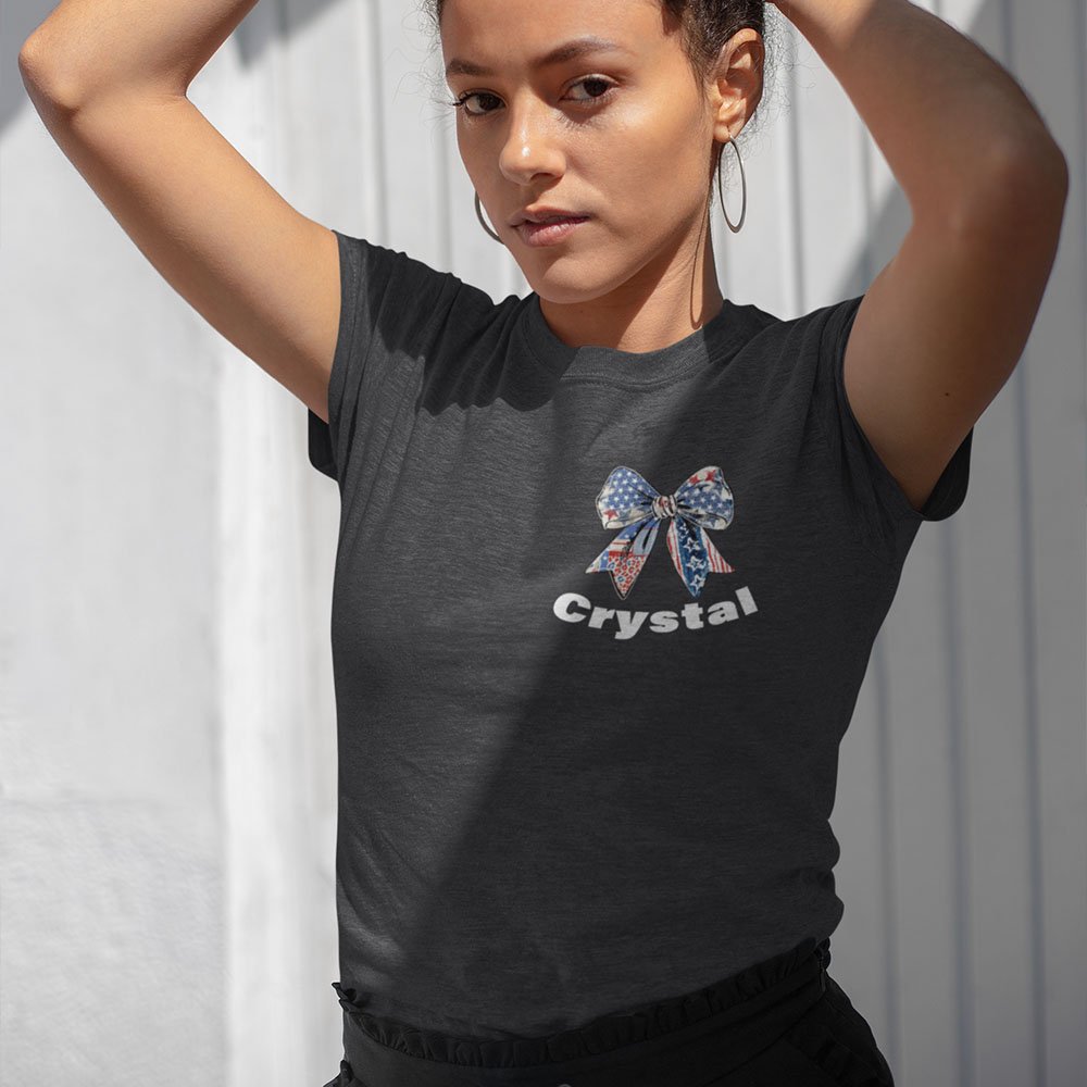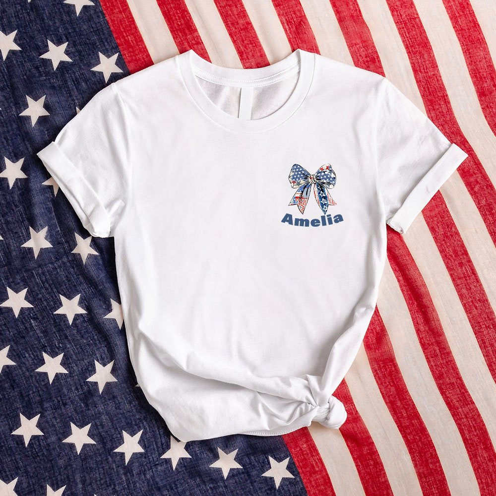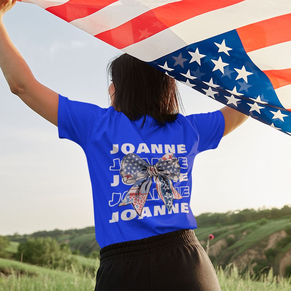 This T-shirt combines patriotic flag elements with a stylish bow, creating a vibrant and passionate atmosphere. Available in 13 color options, you can customize your name on the front and back, making it the perfect expression of individuality and fashion.