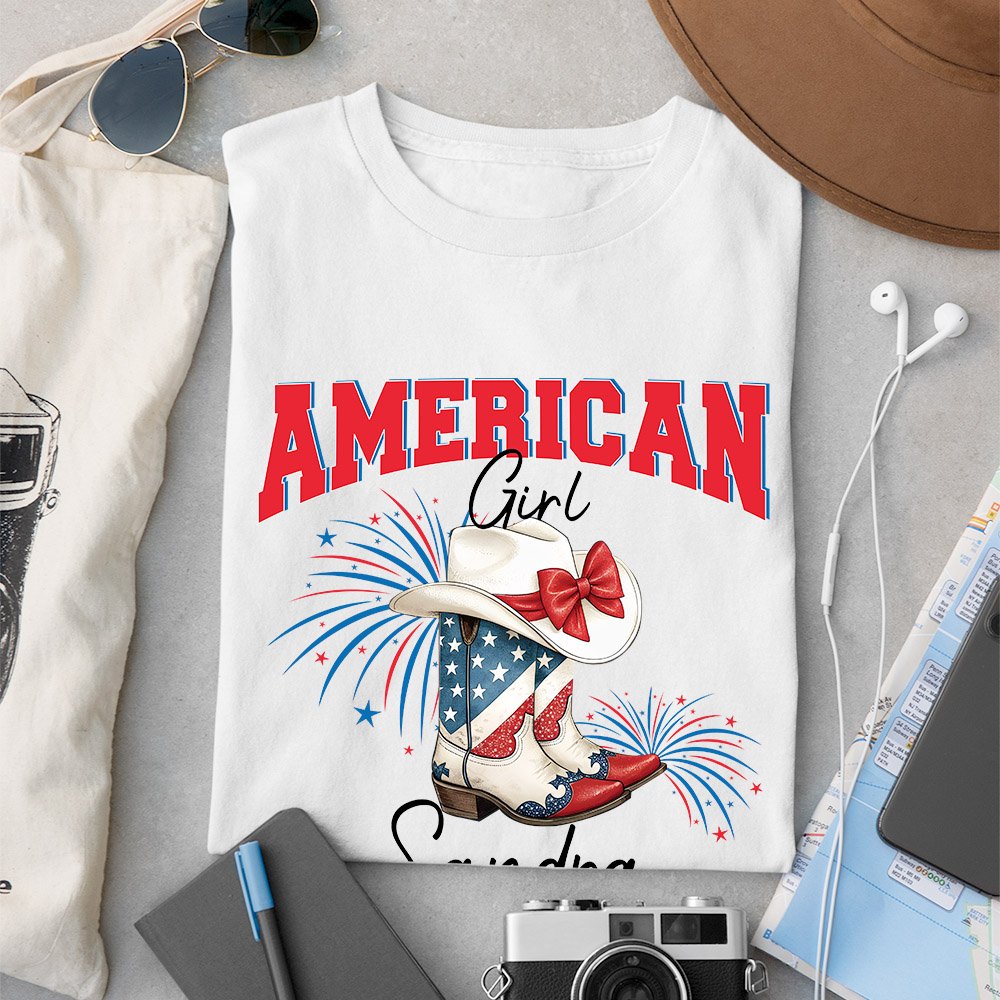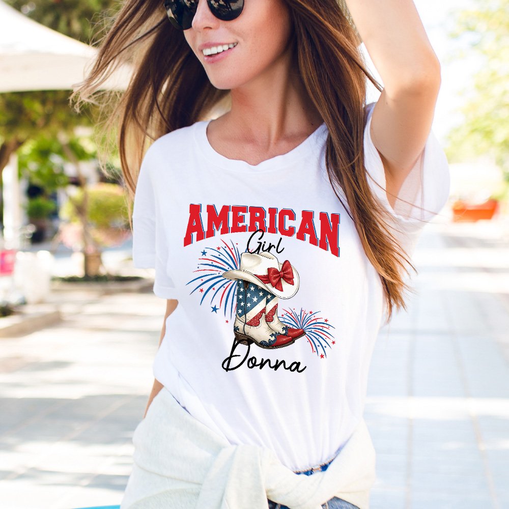 This T-shirt cleverly combines Western elements such as cowboy boots and hats, playful bows, and patriotic patterns with the text "AMERICAN Girl," creating a unique style that celebrates freedom and unity. The vibrant red, white, and blue colors infuse the T-shirt with energy and passion. You can also customize the name on the T-shirt, allowing you to showcase your unique personal charm during Independence Day celebrations.