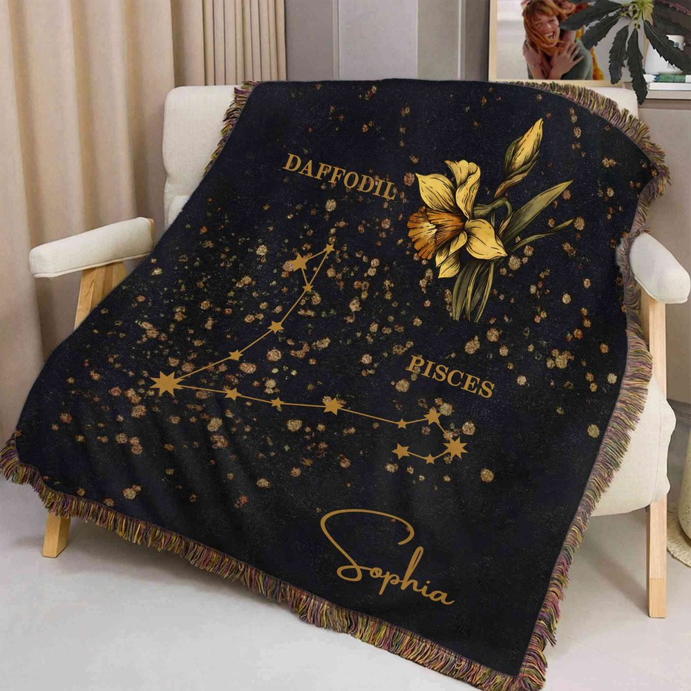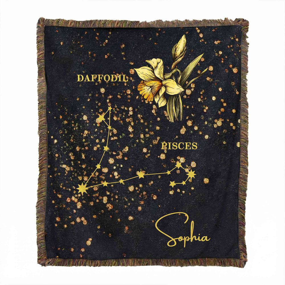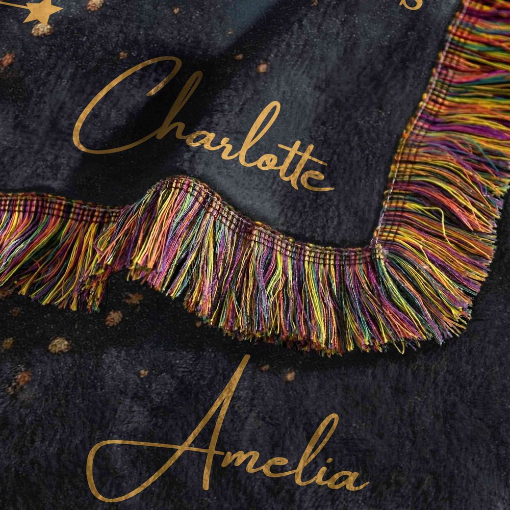 This tassel blanket perfectly blends mysterious constellation patterns with elegant birth flowers. Against a backdrop of a deep night sky, constellation lines and golden stars are interspersed, complemented by beautiful flowers symbolizing birth dates, creating an overall romantic and dreamy atmosphere. The blanket can also be customized with your name, making each piece a unique work of art.