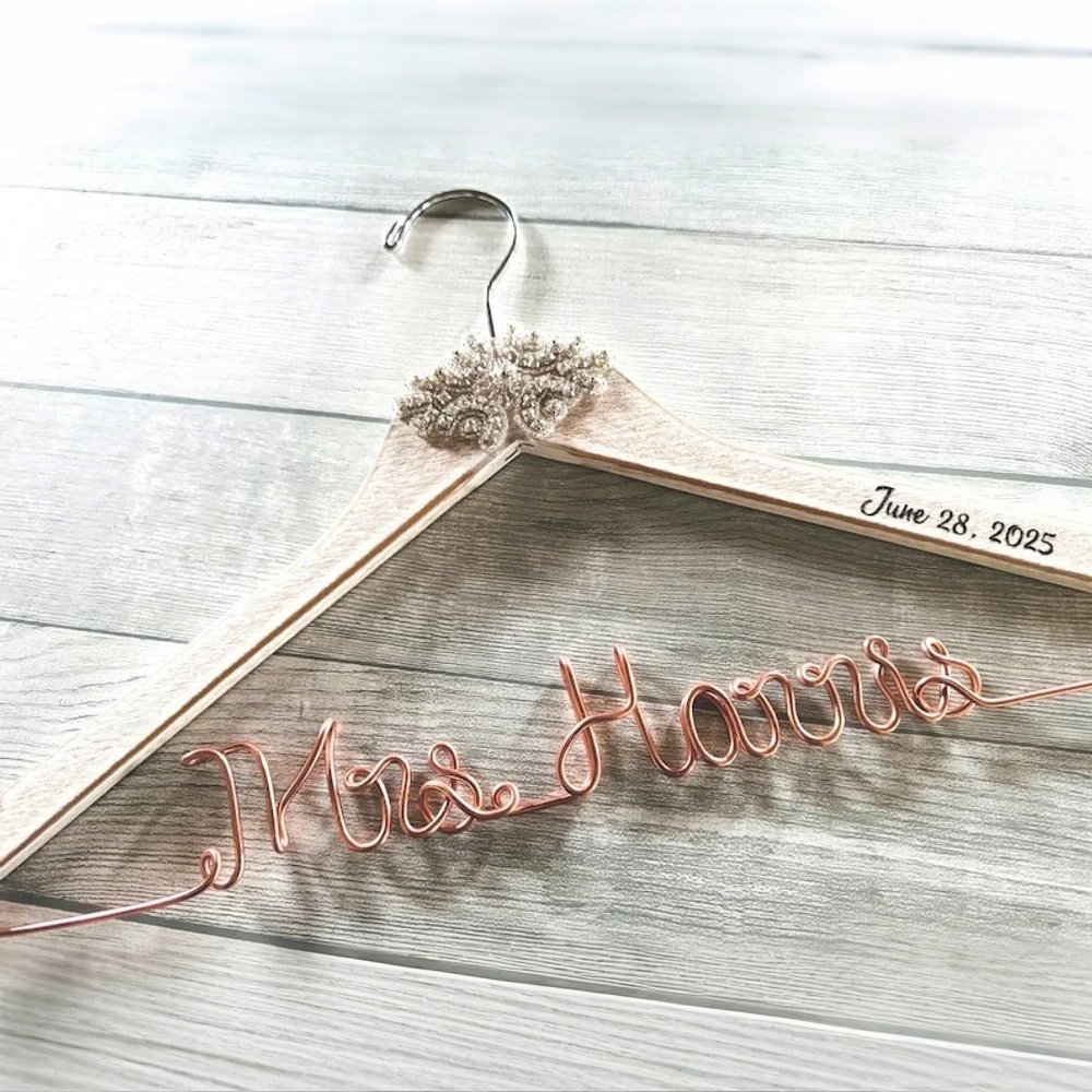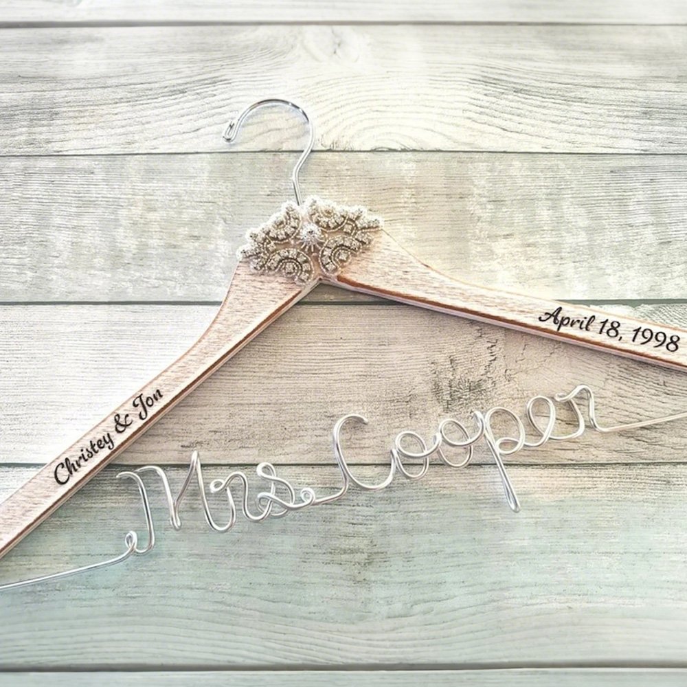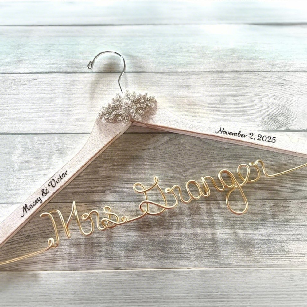• Personalized with name or date • Ideal for wedding dresses, bridesmaid dresses, or robes • Smooth finish to protect delicate fabrics • Sturdy design for full-length gowns • Handmade with care Perfect For • Bride • Bridesmaids • Maid of Honor • Mother of the Bride / Groom • Bridal shower or engagement gift • Wedding day photography props